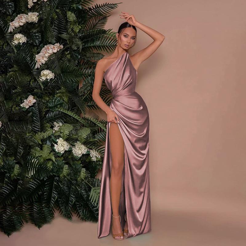 Одно плечо атласное сексуальное платье с разрезом женственное платье с заниженной талией длинное платье