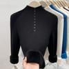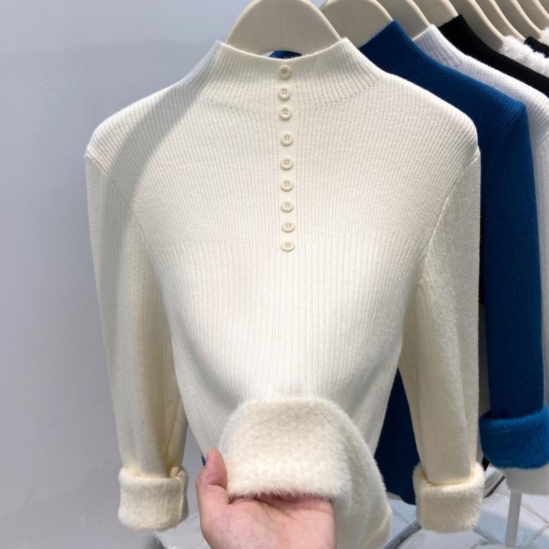 Женский вязаный свитер с полувысоким воротником на пуговицах, утолщенный, с интегрированным флисом, теплый топ, весенняя однотонная базовая футболка