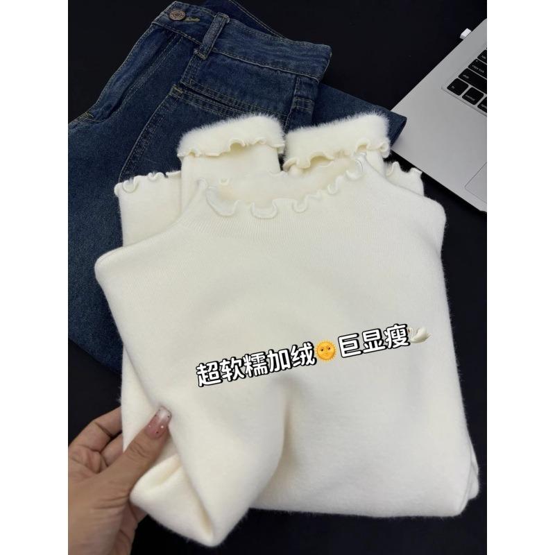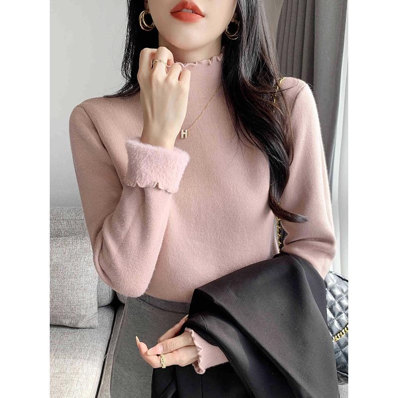 Полуводолазка с фестончатым краем, интегрированный флис, утолщенный вязаный свитер, женский осенне-зимний простой внутренний базовый топ