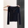 Skinny bottom top with exposed collarbone Women's autumn semi-open neck button pit strip short long-sleeved knitted sweater