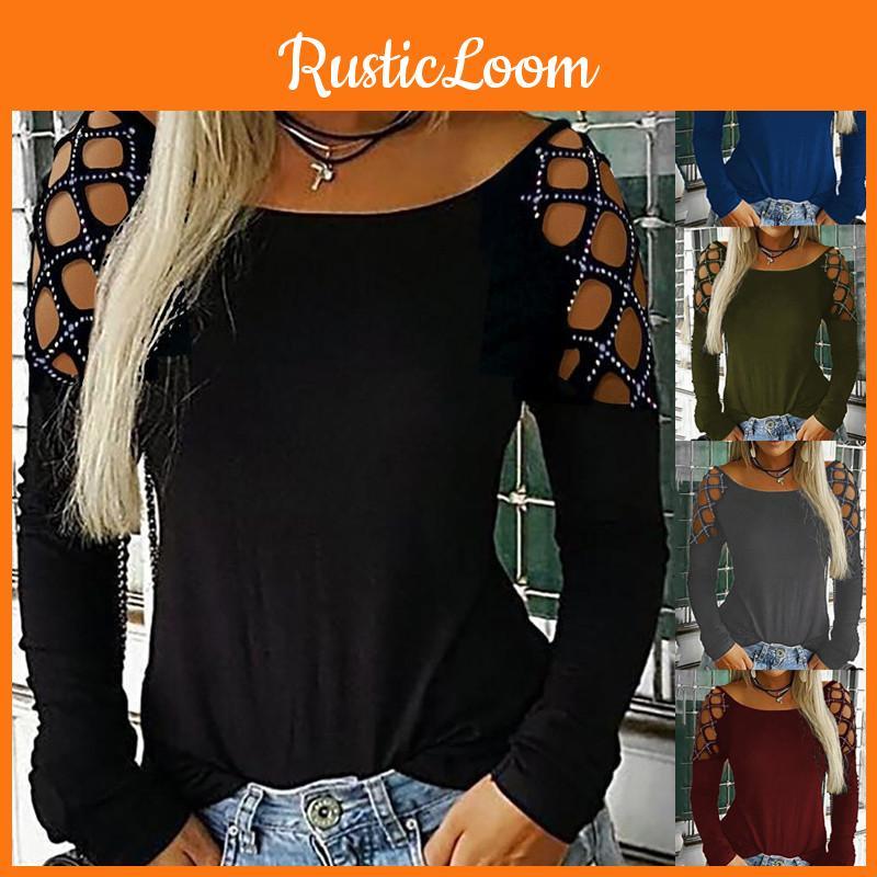 Однотонная футболка с длинным рукавом с вырезами и отделкой стразами для повседневного стиля