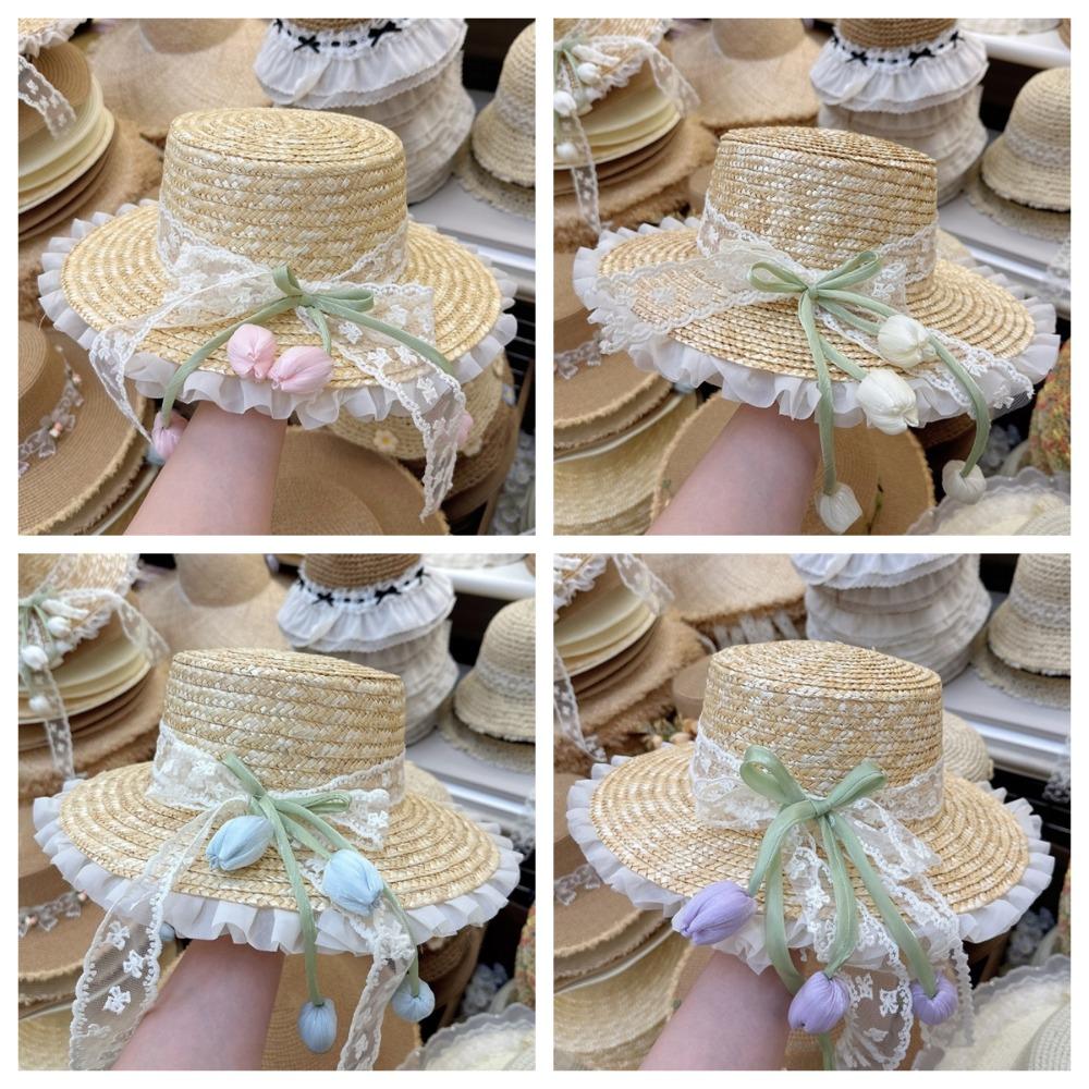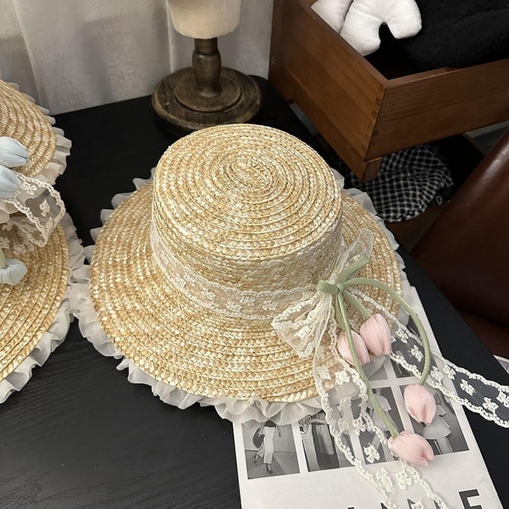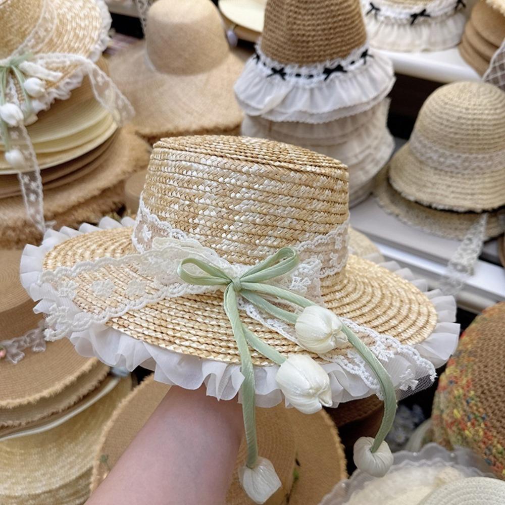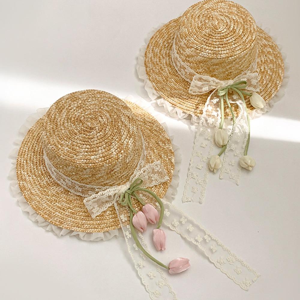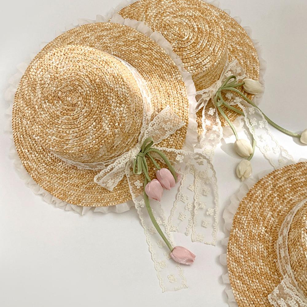Весенняя прогулка с цветами Шляпа-тюльпан с широкими полями Летняя пляжная шляпа от солнца Кружевной бант Соломенная шляпа Пляжный