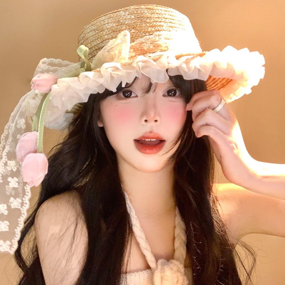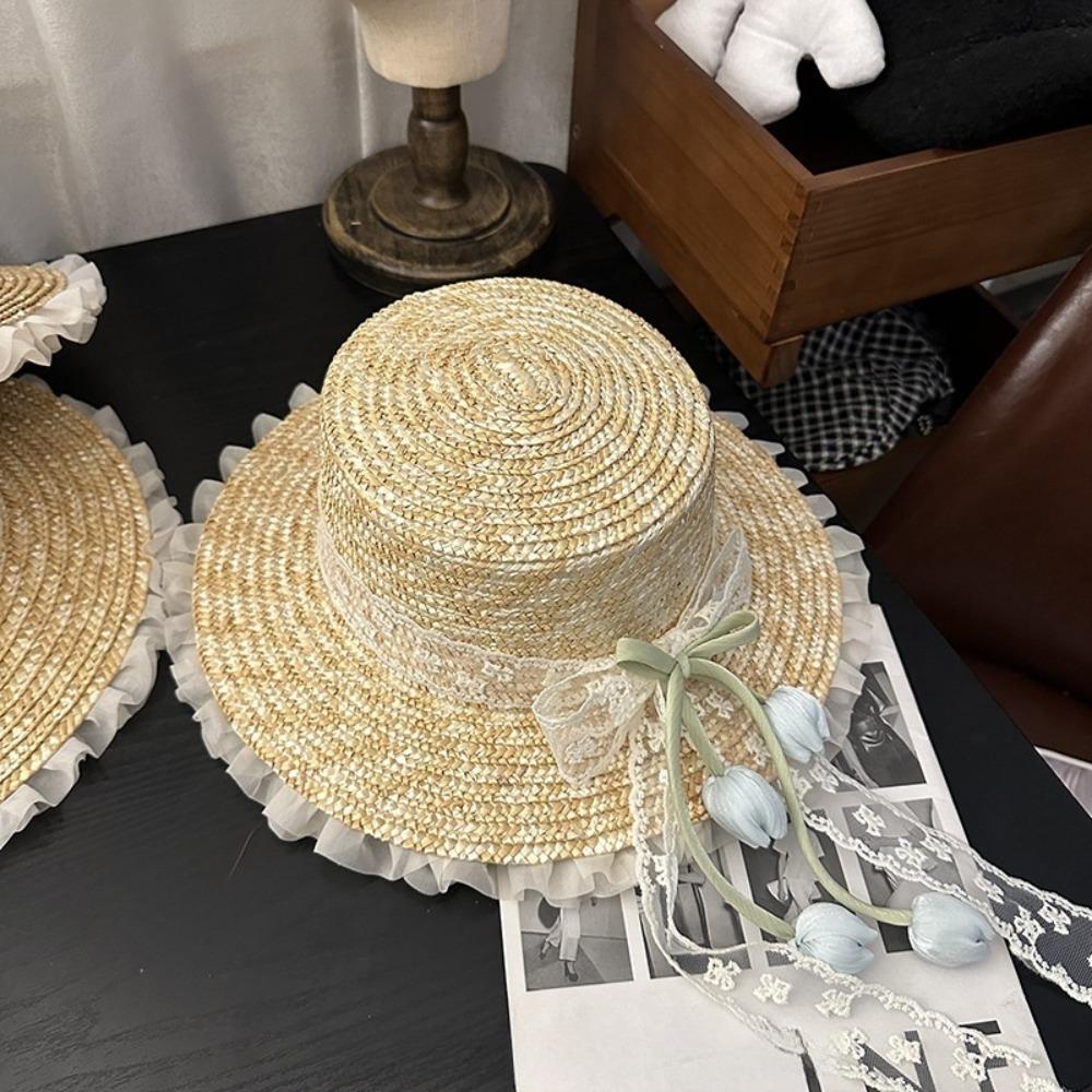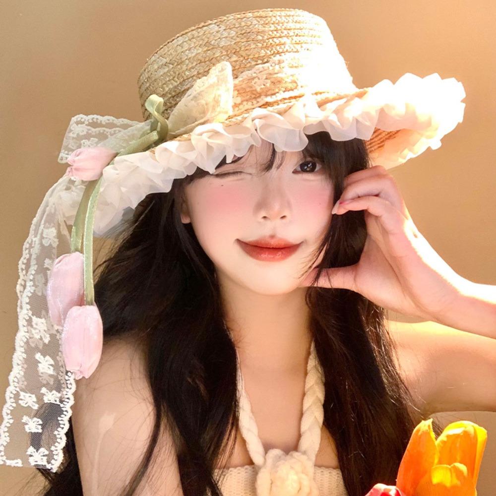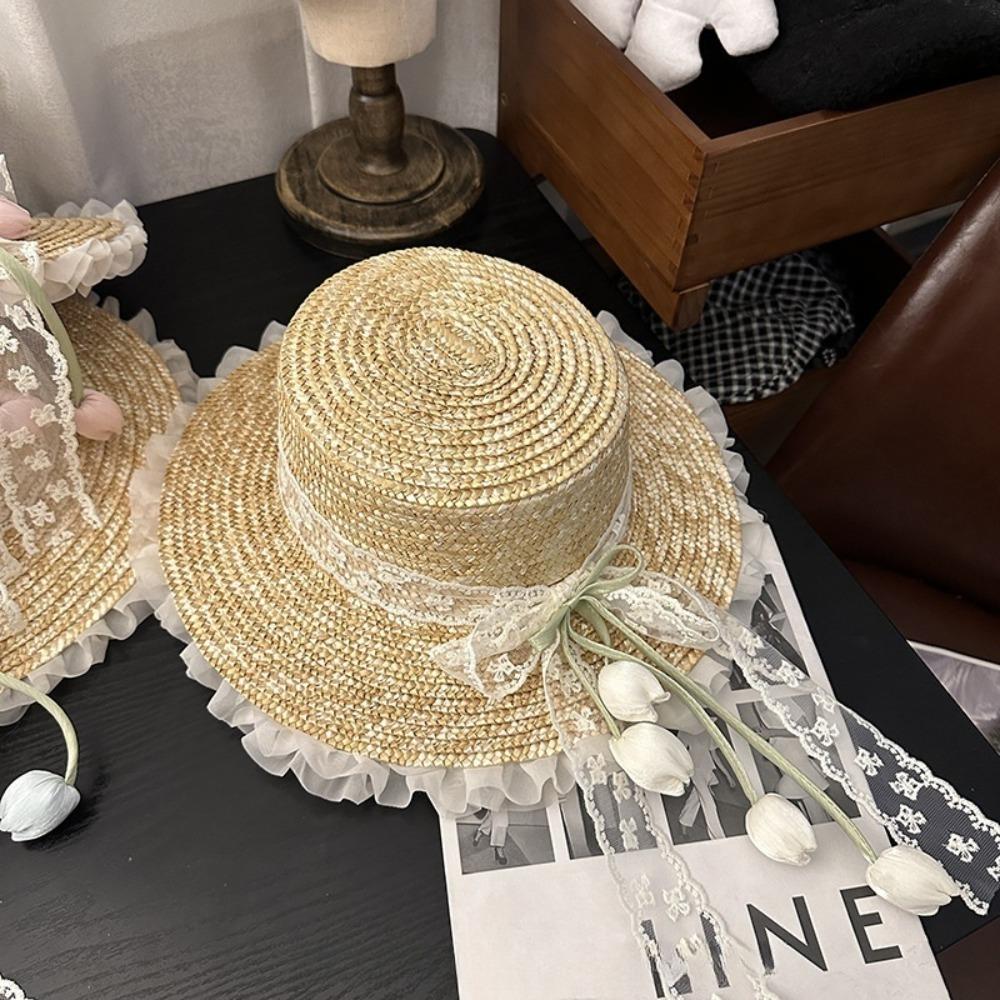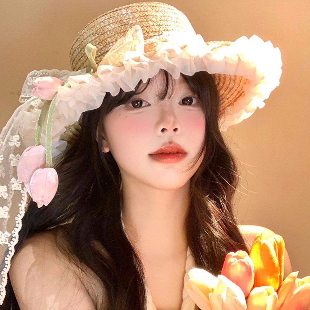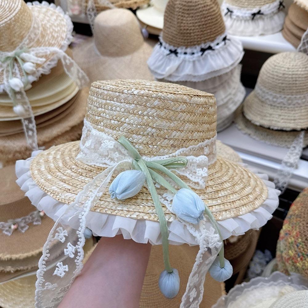Весенняя прогулка с цветами Шляпа-тюльпан с широкими полями Летняя пляжная шляпа от солнца Кружевной бант Соломенная шляпа Пляжный