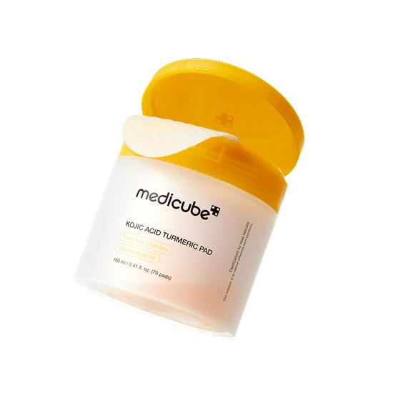 A brightening and resurfacing toner-pad from MEDICUBE that combines the power of kojic acid, turmeric extract, and gentle exfoliating acids to tone, brighten, and smooth skin. Each pre-soaked pad helps remove dead skin cells, fade dark spots and pigmentation, even out skin tone, and leave skin feeling soft and refreshed — perfect as a quick post-cleansing step or mid-week skin boost for face (and even body).