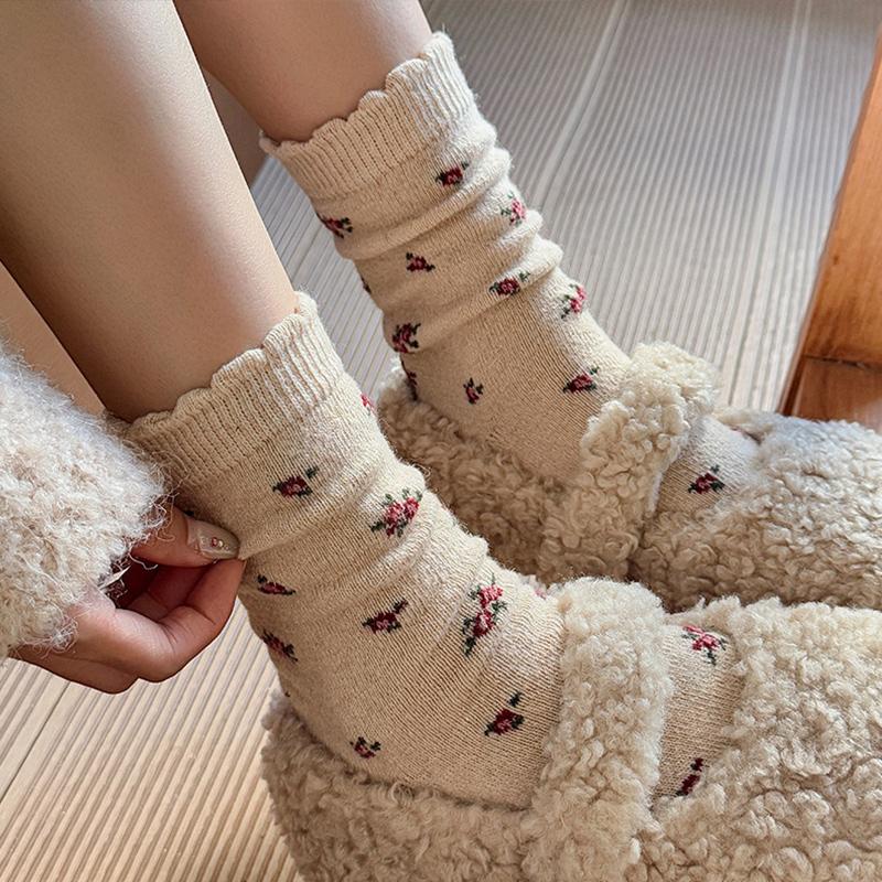 Женские носки Зимние Утепленные Новые Ретро Модные Корейский Стиль Теплые Носки Повседневные Новинки Милые Длинные Женские Носки с Цветами Комфорт