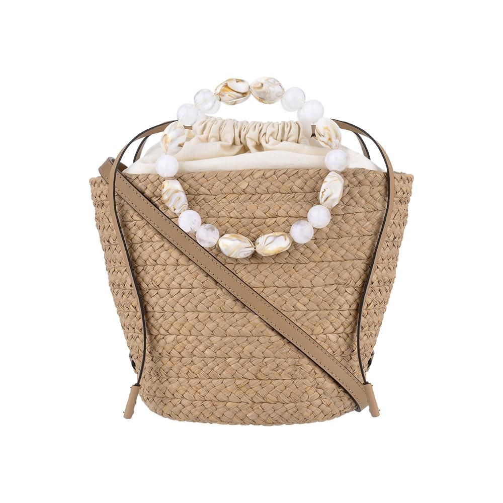 Features: Outer material - 100% Raffia, Accent - 100% Cowhide, Detachable strap, Resin handle, Leather trim, Drawstring lining