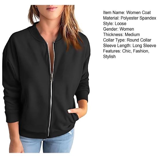 Это высококачественное женское пальто изготовлено из мягкого и удобного полиэстера, идеально подходит для весны и осени.. Простой, но модный дизайн делает его универсальным для различных типов фигуры.. Эта куртка, застегивающаяся на молнию спереди, с длинными рукавами, однотонная и с круглым вырезом, излучает классический стиль..