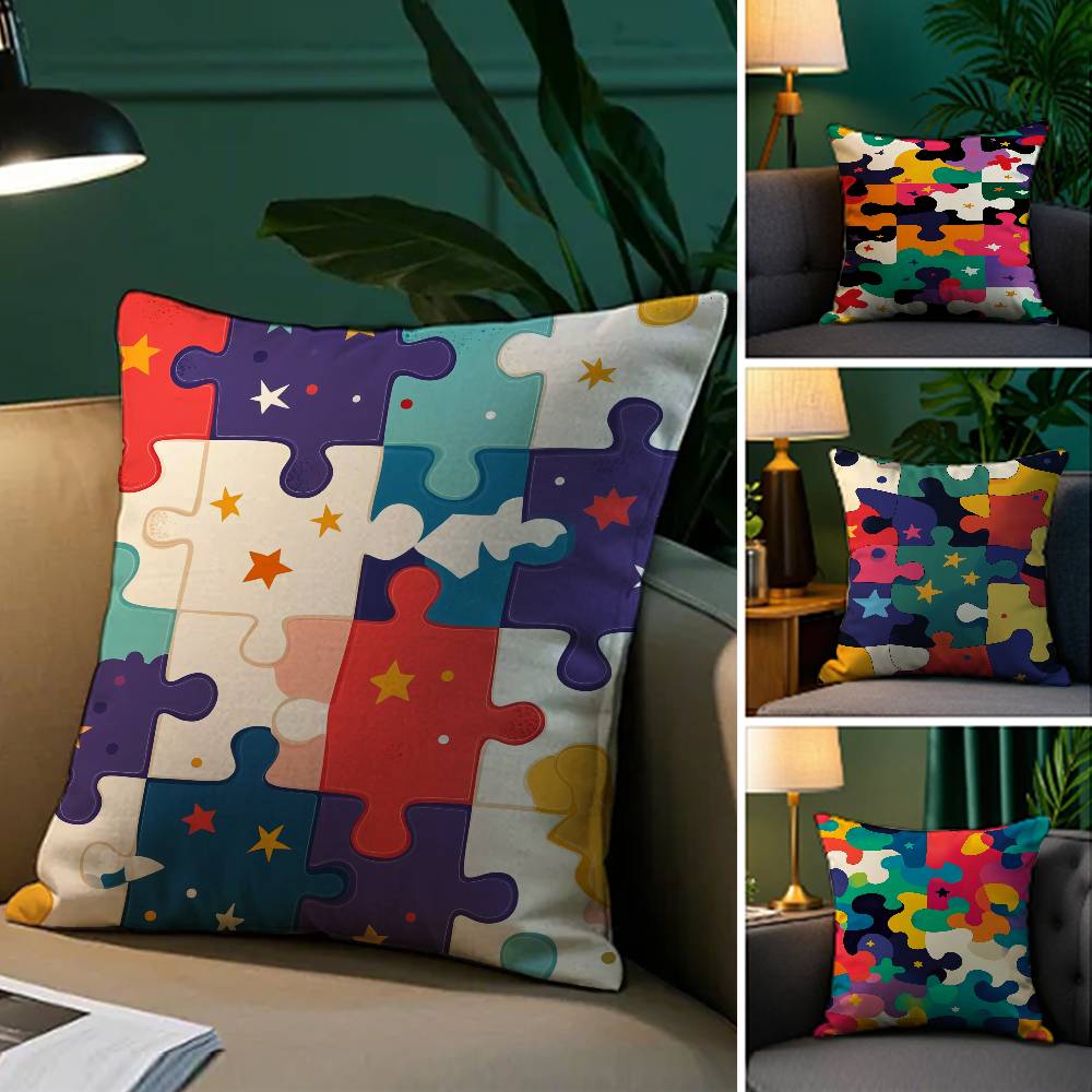 Cute Jigsaw Puzzle Pillow Case Plush Fabric Soft Pillowcase Double Sided Print Sofa Cushion Cover Throw