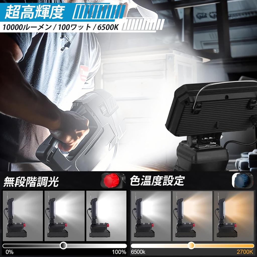 [Диммируемый и с регулируемым цветом прожектор] Этот рабочий свет оснащен четырьмя рядами сверхъярких больших светодиодов и двумя рядами маленьких светодиодов, обеспечивающих яркость до 10 000 люмен. Этот уличный прожектор имеет плавное диммирование и регулировку цветовой температуры (от 1800K закатного света до 6500K освежающего дневного света), позволяя вам свободно выбирать яркость и цвет в соответствии с вашими предпочтениями и ситуациями. Используете ли вы его как расслабляющий свет, привлекающий рыбу для ночной рыбалки, или нуждаетесь в нем как в рабочем свете для освещения большой площади, этот универсальный и удобный светильник позволяет быстро найти идеальное освещение.. Кроме того, прочный крючок позволяет легко повесить его где угодно, а работа без рук повышает эффективность работы.