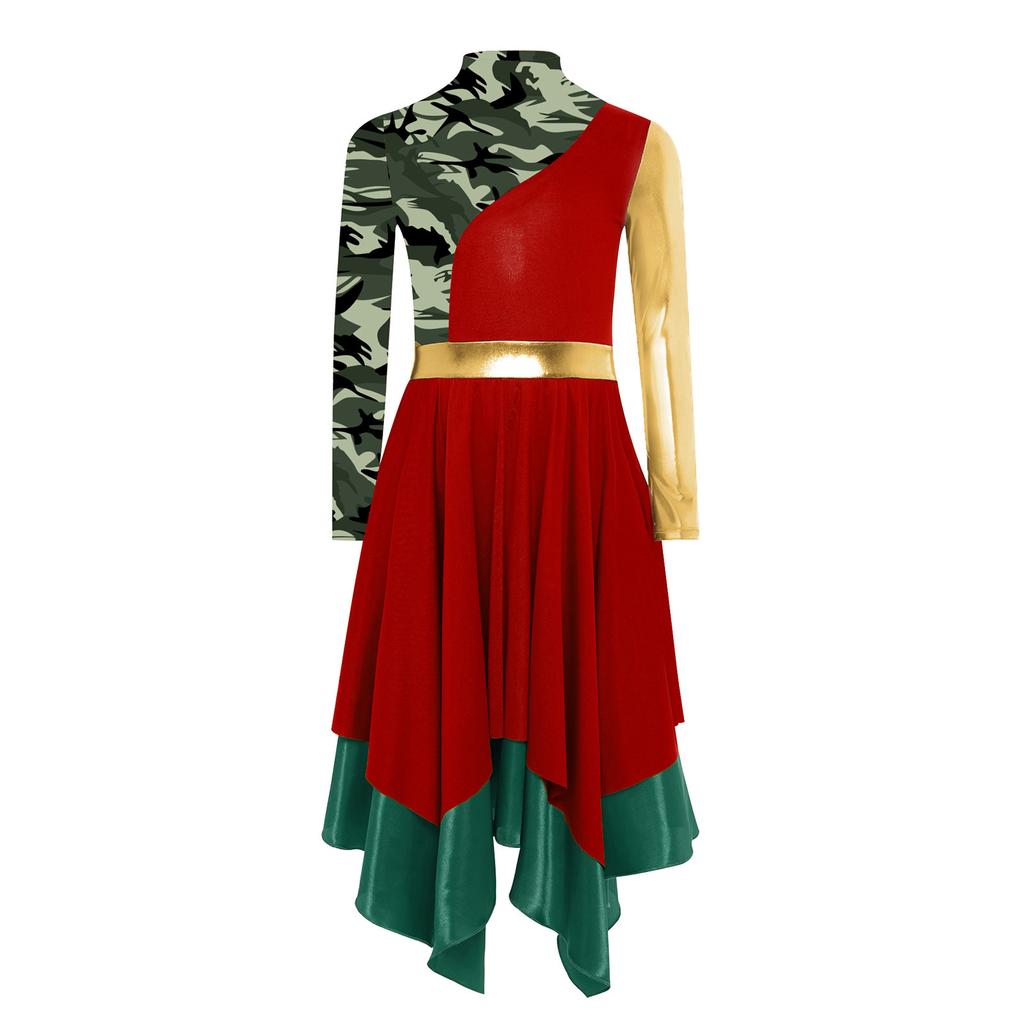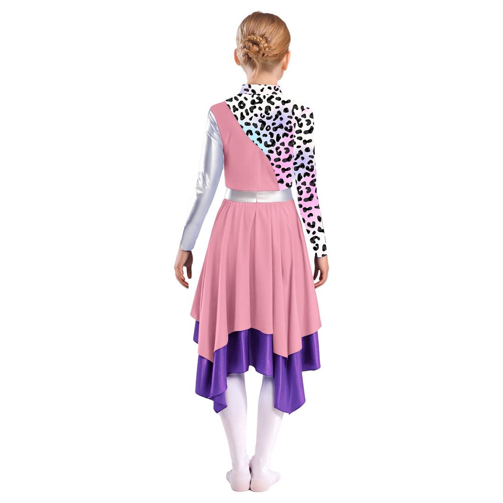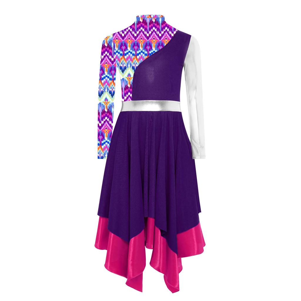 Платье для литургического танца для девочек, с воротником-стойкой, длинным рукавом, стильным принтом, металлическим цветовым блоком, асимметричное
