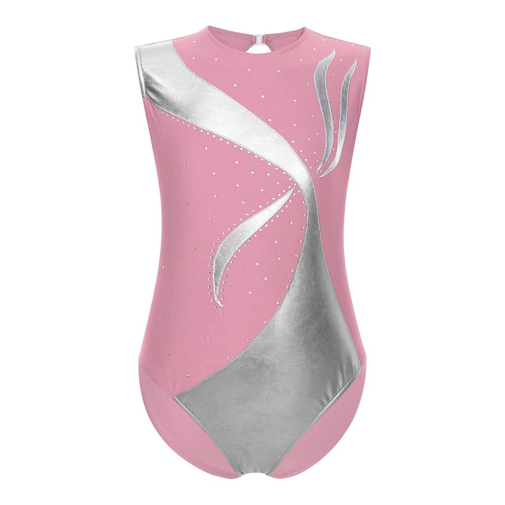 Детский гимнастический купальник для выступлений, металлический, блестящий, пэчворк, стразы, вырез-капелька сзади, без рукавов