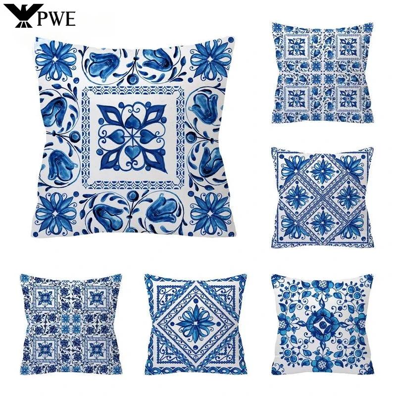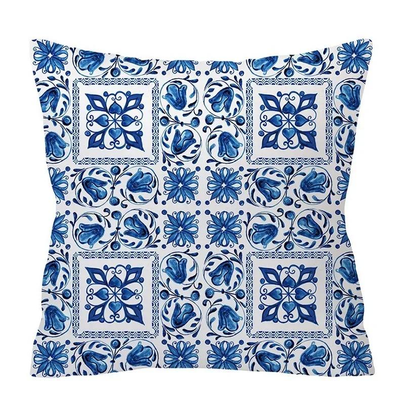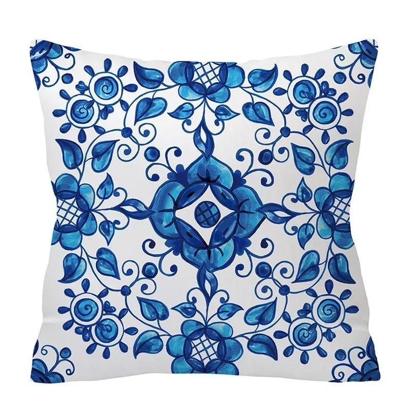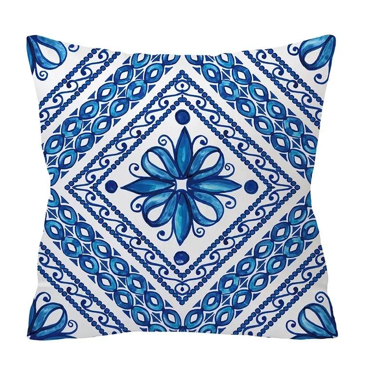 Watercolor Blue Pillowcase Geometry Ethnic Floral Print Cushion Cover Modern Boho Decor Livingroom Sofa Pillowcase 45*45cm