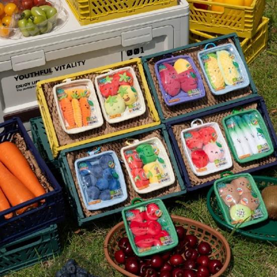 Инновационный дизайн упаковки для свежих продуктов: Вдохновленные ящиками для фруктов и овощей из супермаркета, каждый плюшевый брелок креативно упакован, имитируя выкладку свежих продуктов.. Эта игривая концепция «контрастной милоты» сочетает реалистичный внешний вид с причудливыми смайликами, превращая повседневные ингредиенты в восхитительных, коллекционных компаньонов.