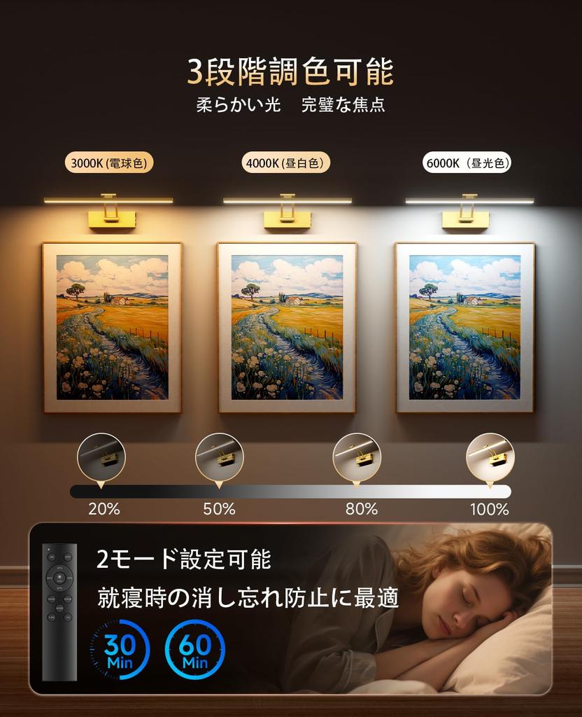 [Многорежимное освещение для рисования] Три режима освещения: 3000K теплый белый, 4500K естественный свет и 6000K белый. Этот настенный светильник для картин оснащен бесступенчатой регулировкой яркости от 10% до 100%, что позволяет точно настраивать его в соответствии с требованиями к экспозиции различных художественных средств.. Пульт дистанционного управления обеспечивает комплексное управление цветовой температурой, яркостью, настройками таймера. (30/60 минут), и функция памяти (автоматически сохраняет последние настройки). Поддерживается двойное управление с помощью боковой сенсорной кнопки и беспроводного пульта дистанционного управления.