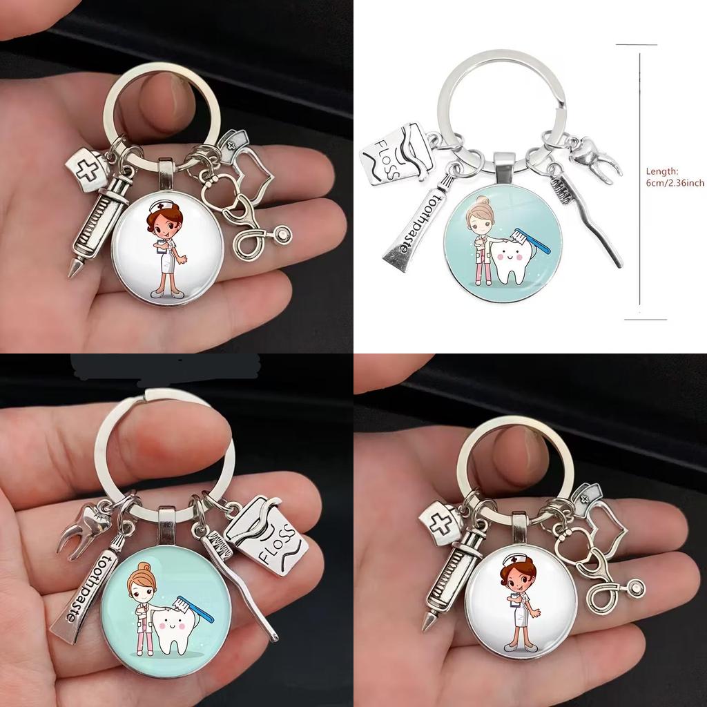 Этот брелок из сплава имеет очаровательный дизайн, вдохновленный стоматологическими инструментами, включая мотив стетоскопа медсестры и шприца, поддерживающий повседневную организацию и украшение. Он отличается прочностью с полированной металлической отделкой.. Идеально подходит для подарка на праздники или по особым случаям, его можно использовать в качестве продуманного знака признательности.. Протирайте мягкой тканью для поддержания блеска.