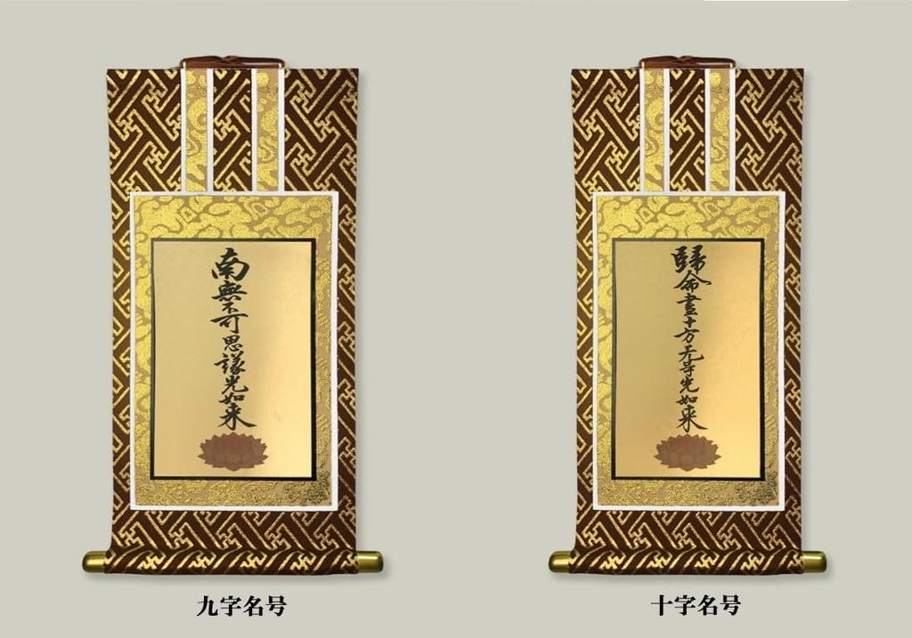 Набор из двух подвесных свитков от Буддийского алтаря Кё-Исэмура. Доступен в различных сектах и размерах. Буддийский свиток для алтаря Дзёдо Синсю: Шурен (20-е, Дзёдо