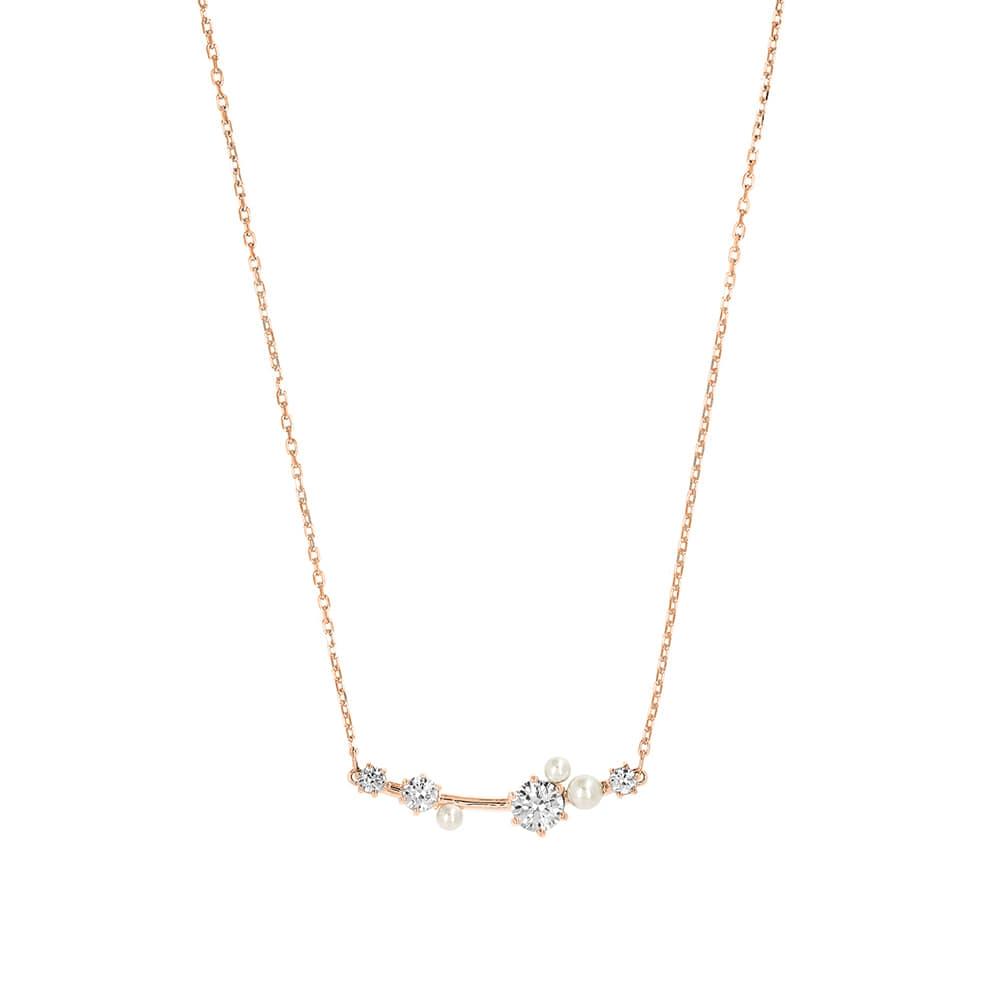 The women's necklace from the Swarovski Constella collection features a white color and is designed to exude luxury. Adorned with a variety of Swarovski zirconia and crystal pearls in different sizes, the overall rose gold plating gives it an elegant and sophisticated appearance. With a pulling mechanism, the necklace can be styled as both a necklace and a choker, and a sliding ball clasp allows for easy length adjustment. The length can be adjusted from a basic 38cm to a maximum of 48cm to fit the thickness of one's neck. The motif size measures 0.9 x 4.4cm, emphasizing a light and feminine touch.