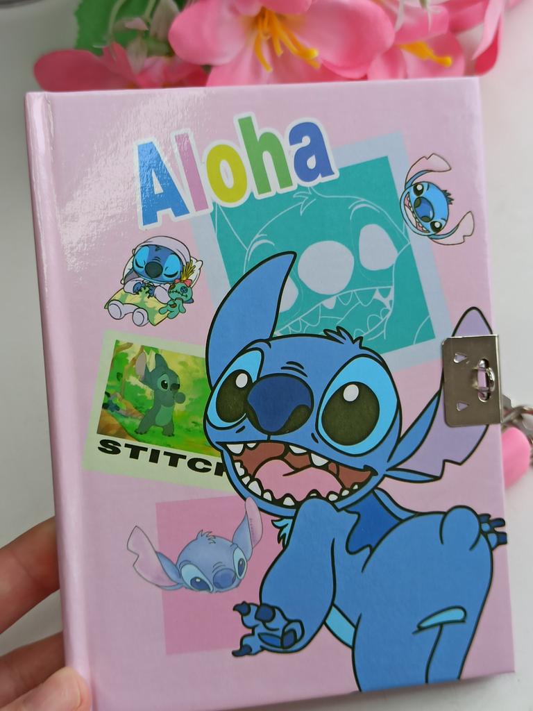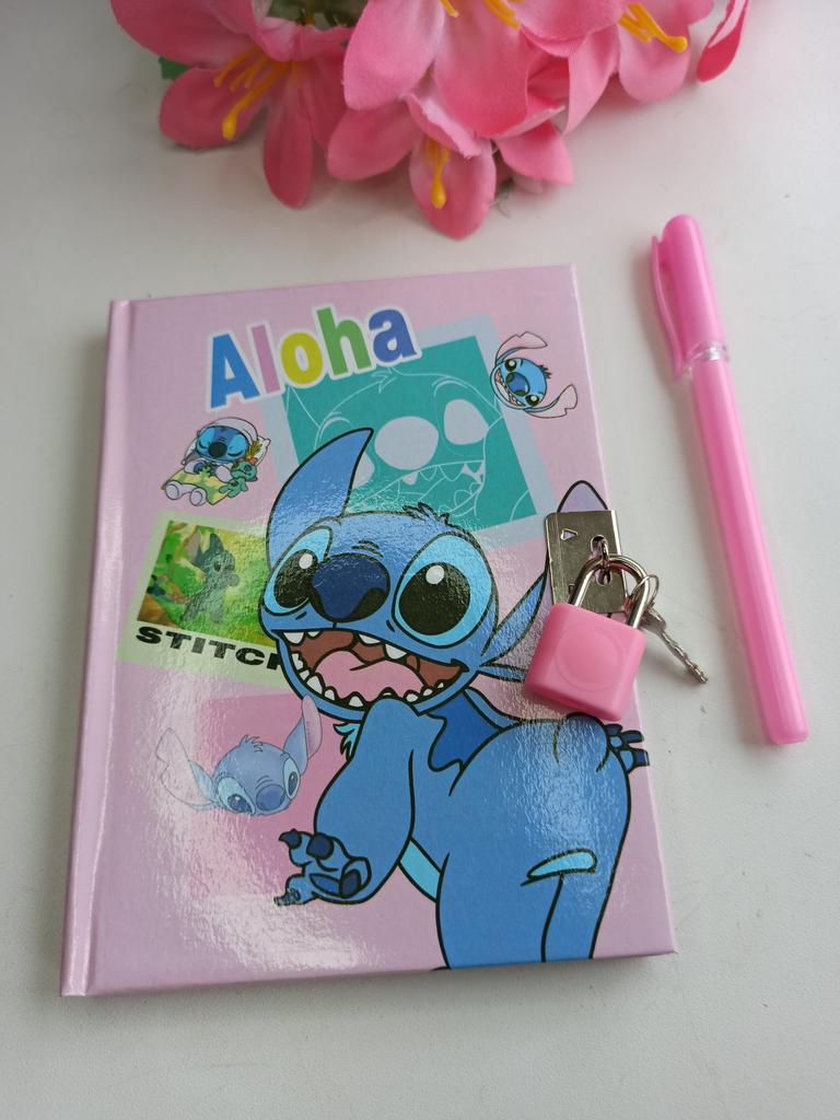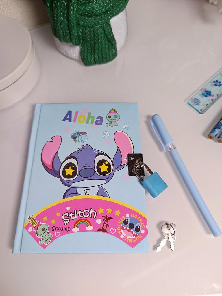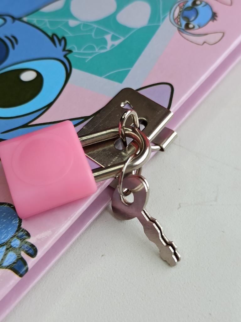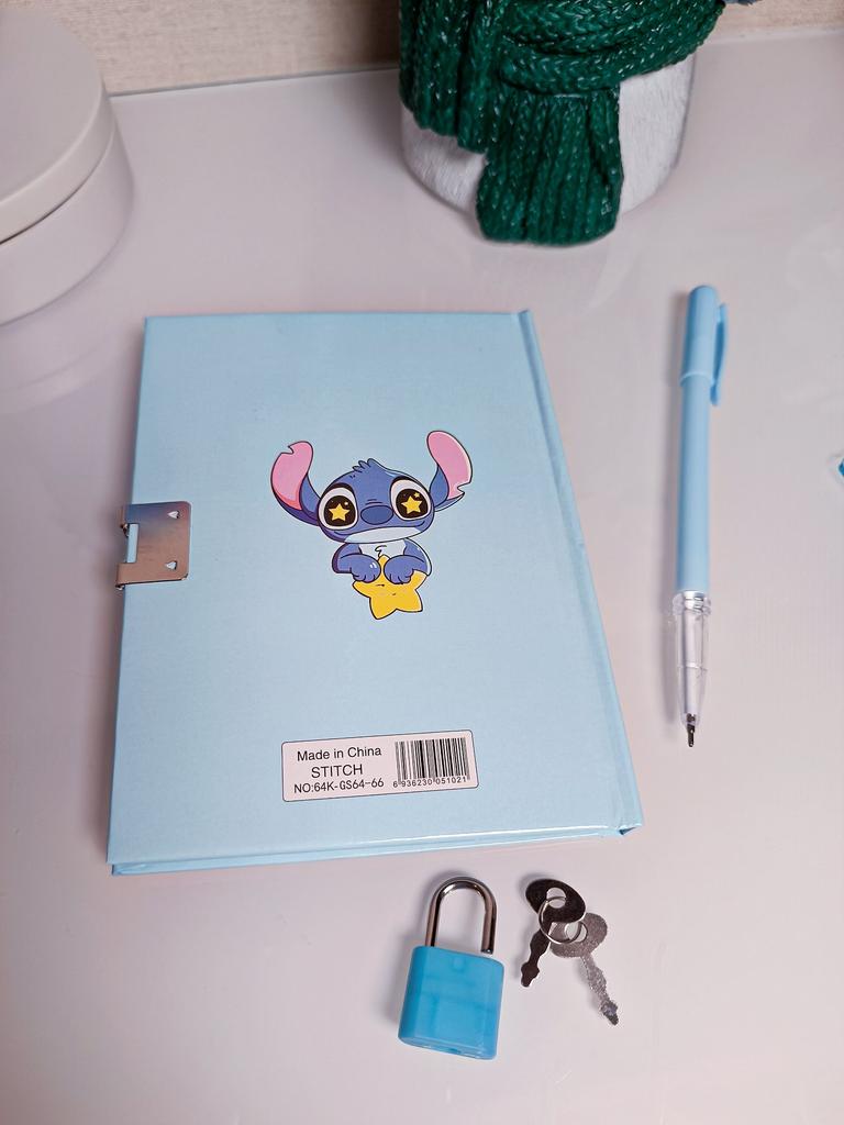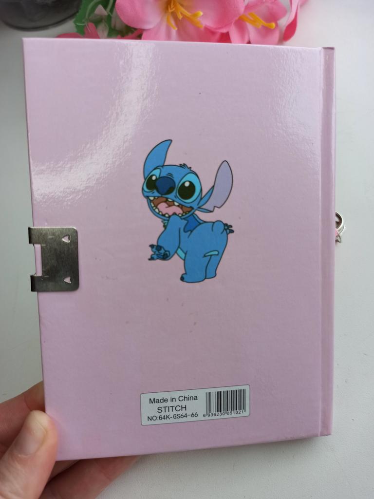 Блокнот на замочке и с ручкой Основным преимуществом является то, что он находится на замочке, за счёт чего никакие ваши записи и тайны не смогут свободно просмотреть посторонние. Мне этот блокнот напомнил мой с детства, где я записывала свои секретки и вела дневник. Блокнот с рисунком Стича. Еслть в 2 цветах. Большой плюс этого блокнота – твердая обложка, как у книги. Это придает ему как респектабельный стильный вид, так и увеличит срок ее пользования. Формат блокнота: А5. Внутри – голубые и розовые листы с цветным декором, линовка в линейку. Писать секреты будет удобно и приятно! Дочке блокнот очень понравился. Заказом довольная. Рекомендую!