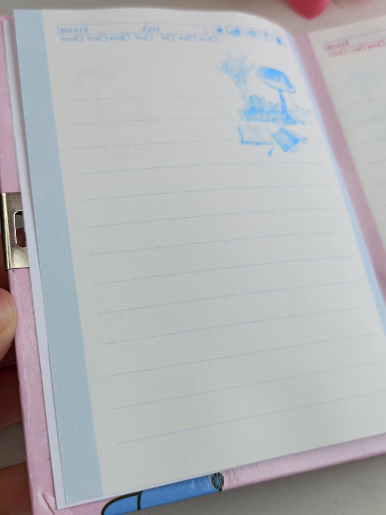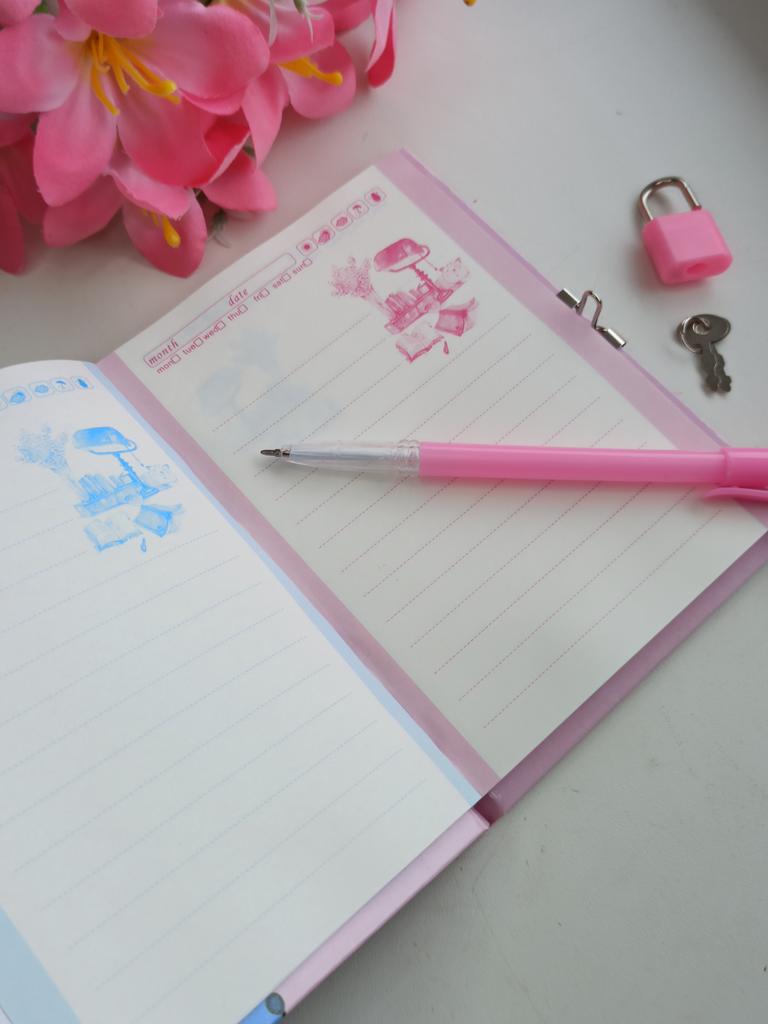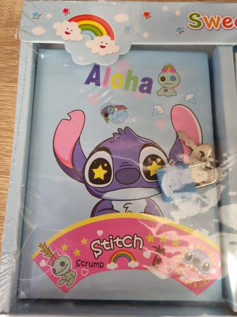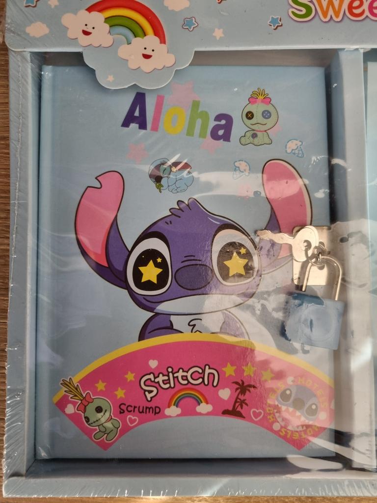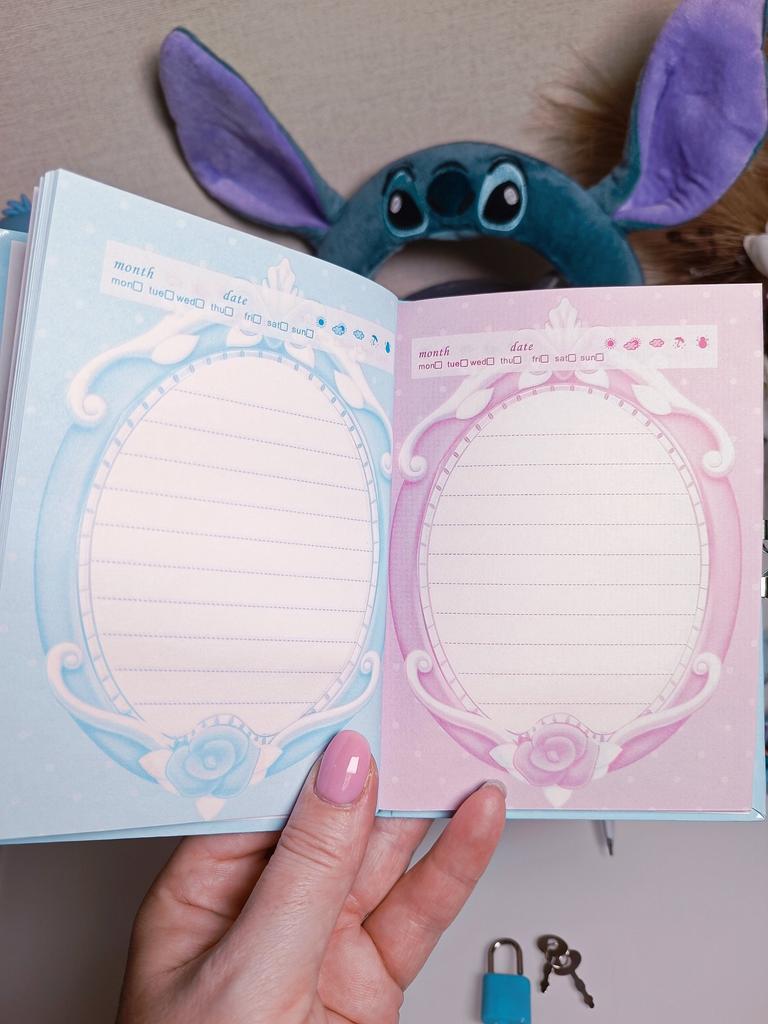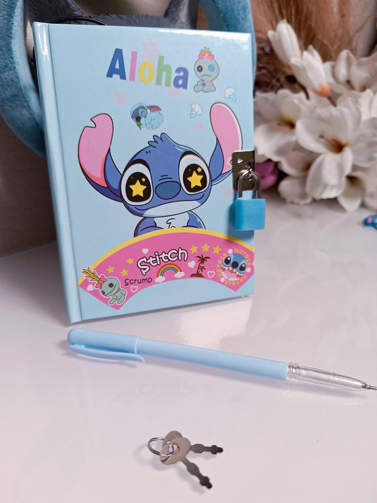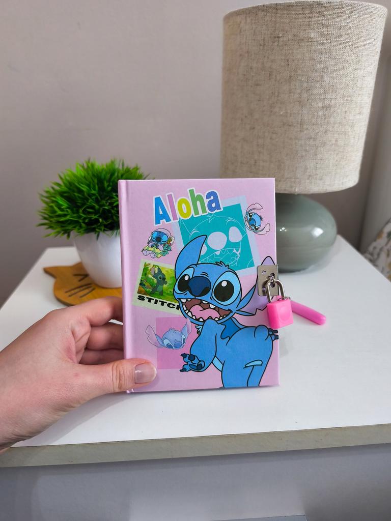 Блокнот на замочке и с ручкой Основным преимуществом является то, что он находится на замочке, за счёт чего никакие ваши записи и тайны не смогут свободно просмотреть посторонние. Мне этот блокнот напомнил мой с детства, где я записывала свои секретки и вела дневник. Блокнот с рисунком Стича. Еслть в 2 цветах. Большой плюс этого блокнота – твердая обложка, как у книги. Это придает ему как респектабельный стильный вид, так и увеличит срок ее пользования. Формат блокнота: А5. Внутри – голубые и розовые листы с цветным декором, линовка в линейку. Писать секреты будет удобно и приятно! Дочке блокнот очень понравился. Заказом довольная. Рекомендую!