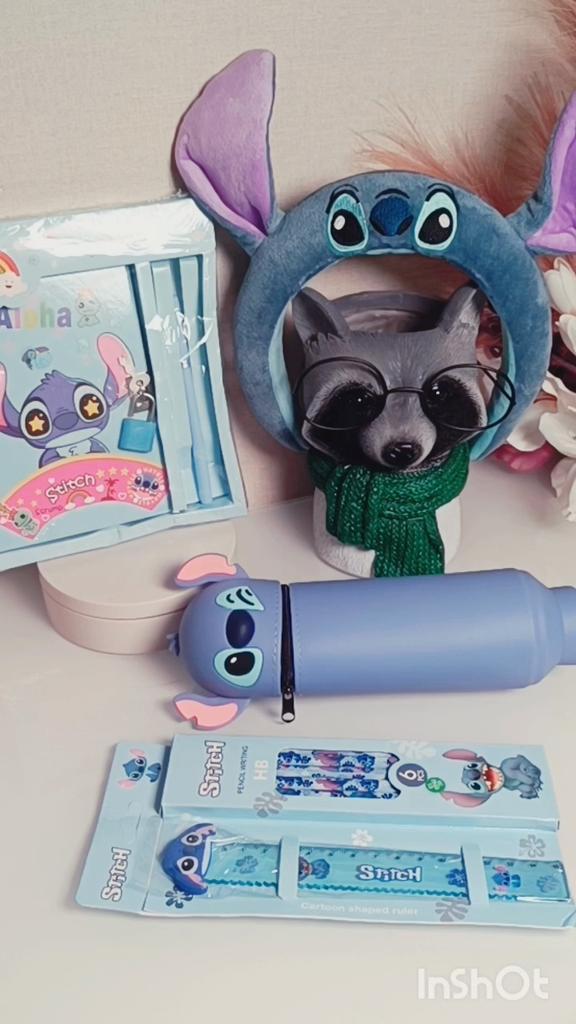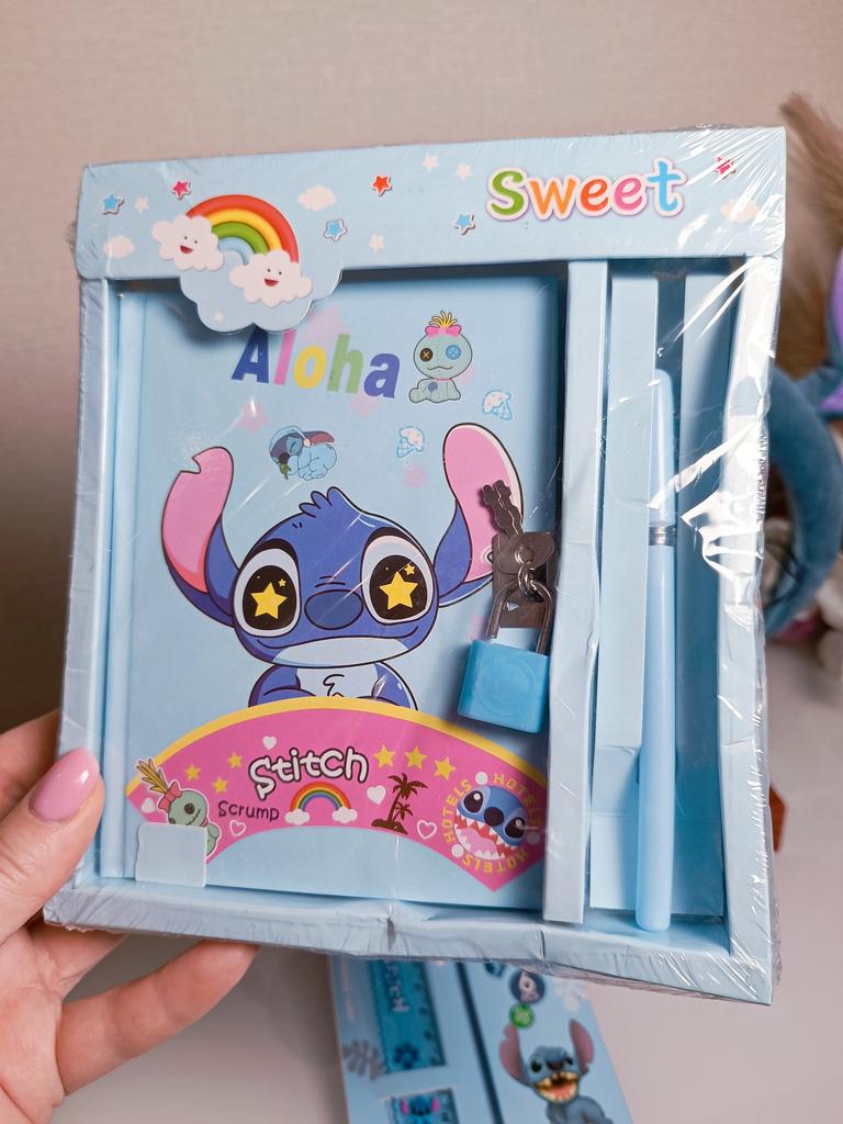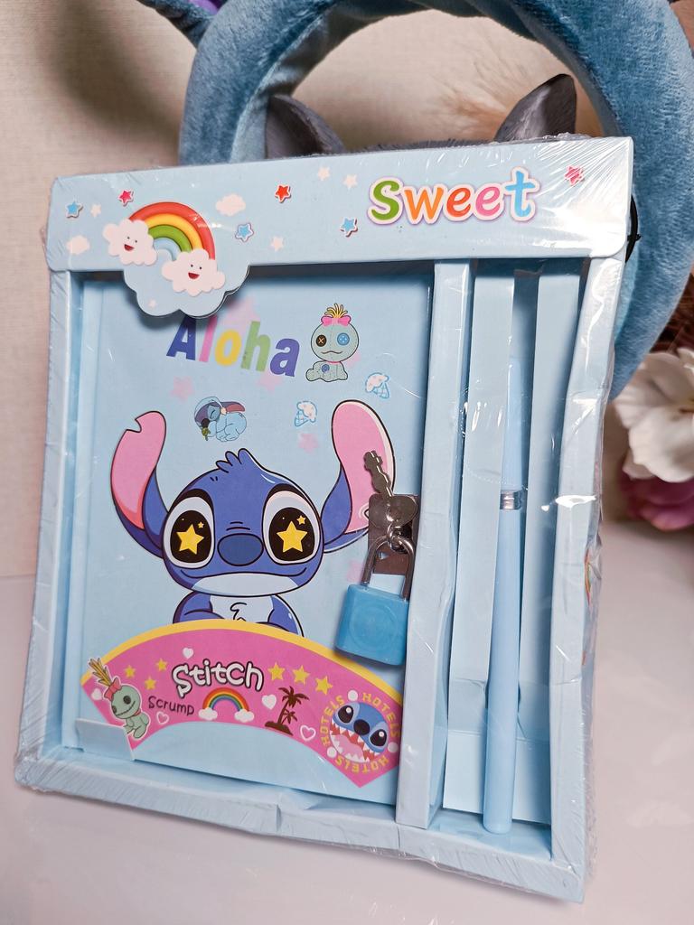 Набор для записей «Lilo & Stitch» Этот милый розовый комплект — отличный вариант для подарка ребенку или фанату мультфильма. Что входит в набор: 🔸Дневник: Компактный блокнот в твердом переплете с ярким принтом Стича и надписью «Aloha». 🔸Замок с ключами: Настоящий мини-замок (в комплекте 2 ключа), который позволяет хранить секреты под замком. 🔸Ручка: Розовая ручка в тон, закрепленная в специальном отсеке упаковки. Плюсы: * Дизайн: Очень эстетичное оформление в стиле «kawaii». * Готовое решение: Набор уже красиво упакован в коробку с надписью «Bless You» — не нужно думать об обертке. * Функциональность: Замок добавляет элементу игры и приватности. Симпатичный и бюджетный подарок, который точно порадует любителей канцелярии и персонажей Disney.
