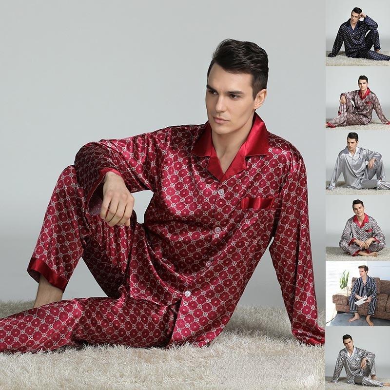 2025 Новый мужской шелковый атласный классический пижамный комплект с длинным рукавом и принтом Роскошный шелковый пижамный комплект для сна — купить товар онлайн с бесплатной доставкой по всему миру!