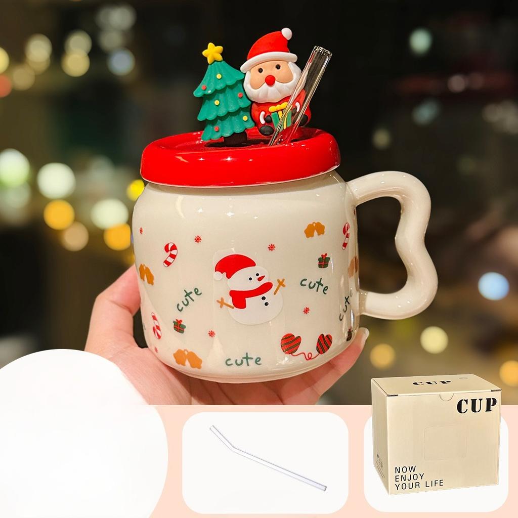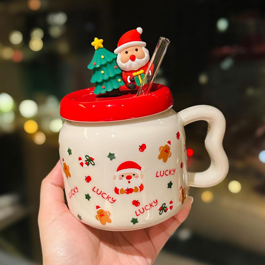 Cute Cartoon Santa Claus Ceramic Mug with Lid High Looking Straw Cup Christmas Gift Souvenir