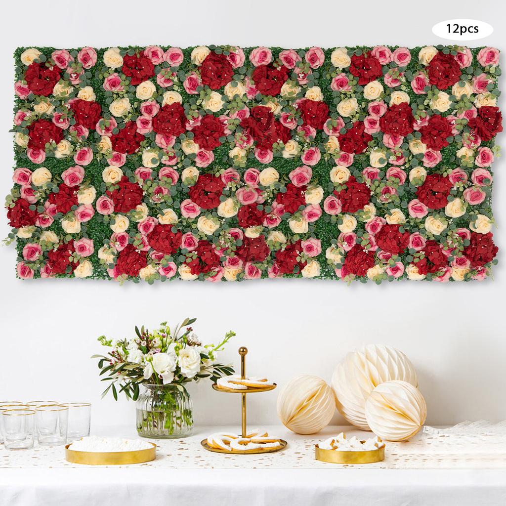 12-Piece Artificial Rose Hydrangea Flower Wall Backdrop, Faux Hanging Floral Panel Decor for Wedding Bridal Shower Party Decor