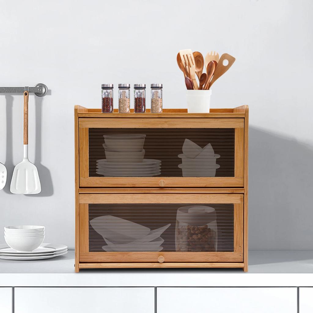 Bymoacar Wooden 2-layer Storage Box 20.5*9.8*7.9 in, Fully Sealed Tabletop Bamboo Cabinet W/ Handle for Kitchen, Bedroom & Study