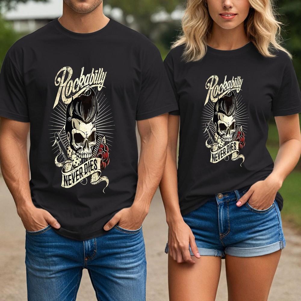 Рубашка с черепом в стиле рокабилли, унисекс, винтажная музыкальная футболка, никогда не умирает, тату, ретро стиль