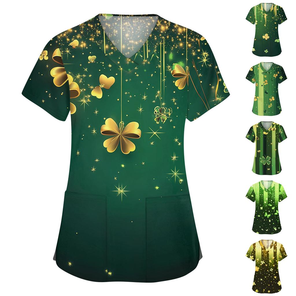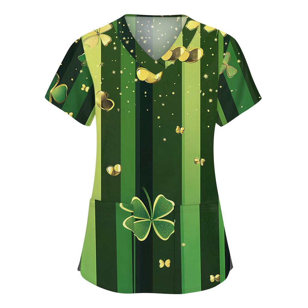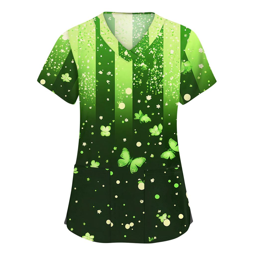 Женская мода с v-образным вырезом, короткими рукавами и карманами, топы с принтом