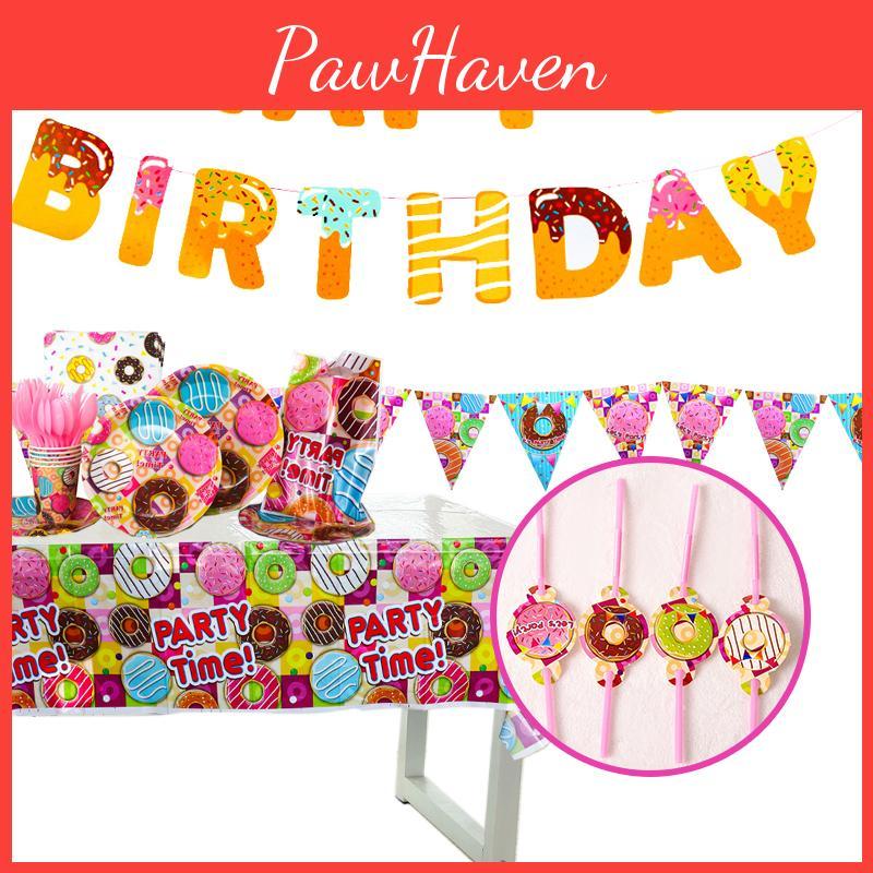Colorful Donuts Birthday Party Supplies Featuring Plates Cups Tablecloth And Banner