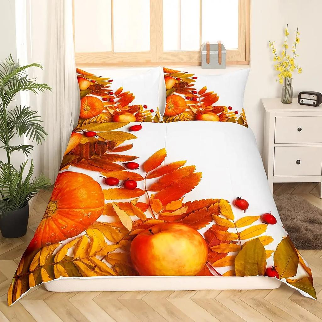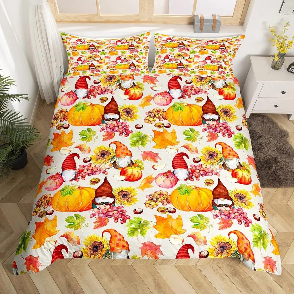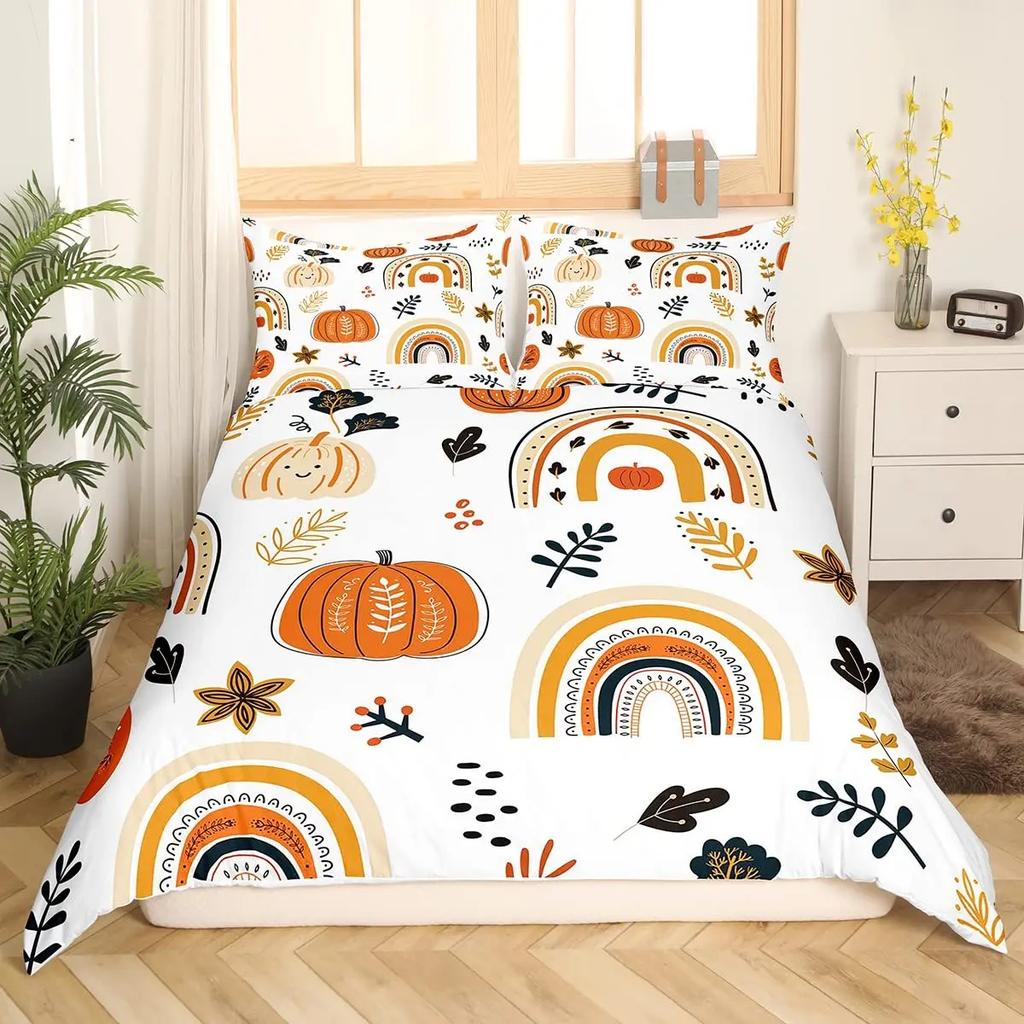 Thanksgiving Day Pumpkin King Queen Bedding Set Kids Cartoon Autumn Duvet Cover Fall Leaf Comforter Cover Polyester Quilt Cover