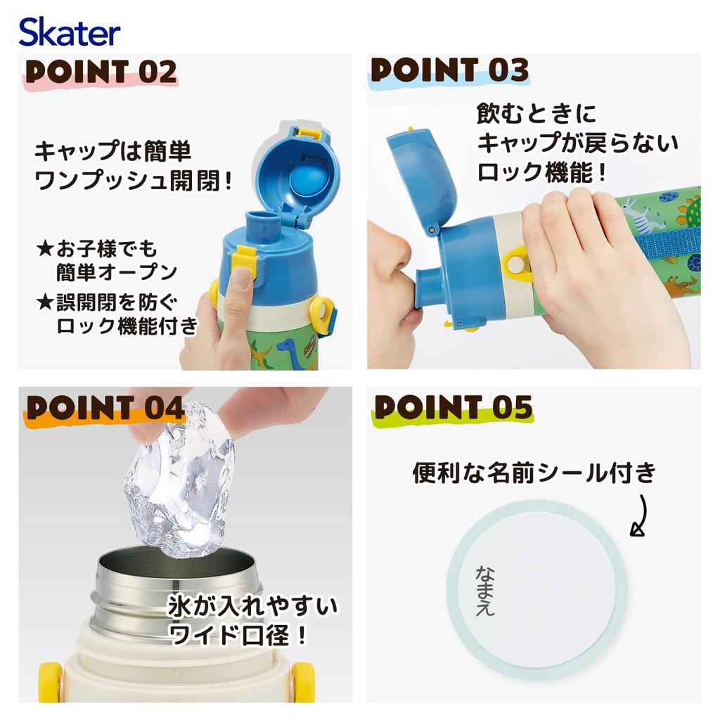 Skater Water 420ml or 350ml Dinosaur Size Small Stainless Sports Water Children's Bottle, 2-Way, (Direct Drink) (Cup Drink), Design, 26, Boys,