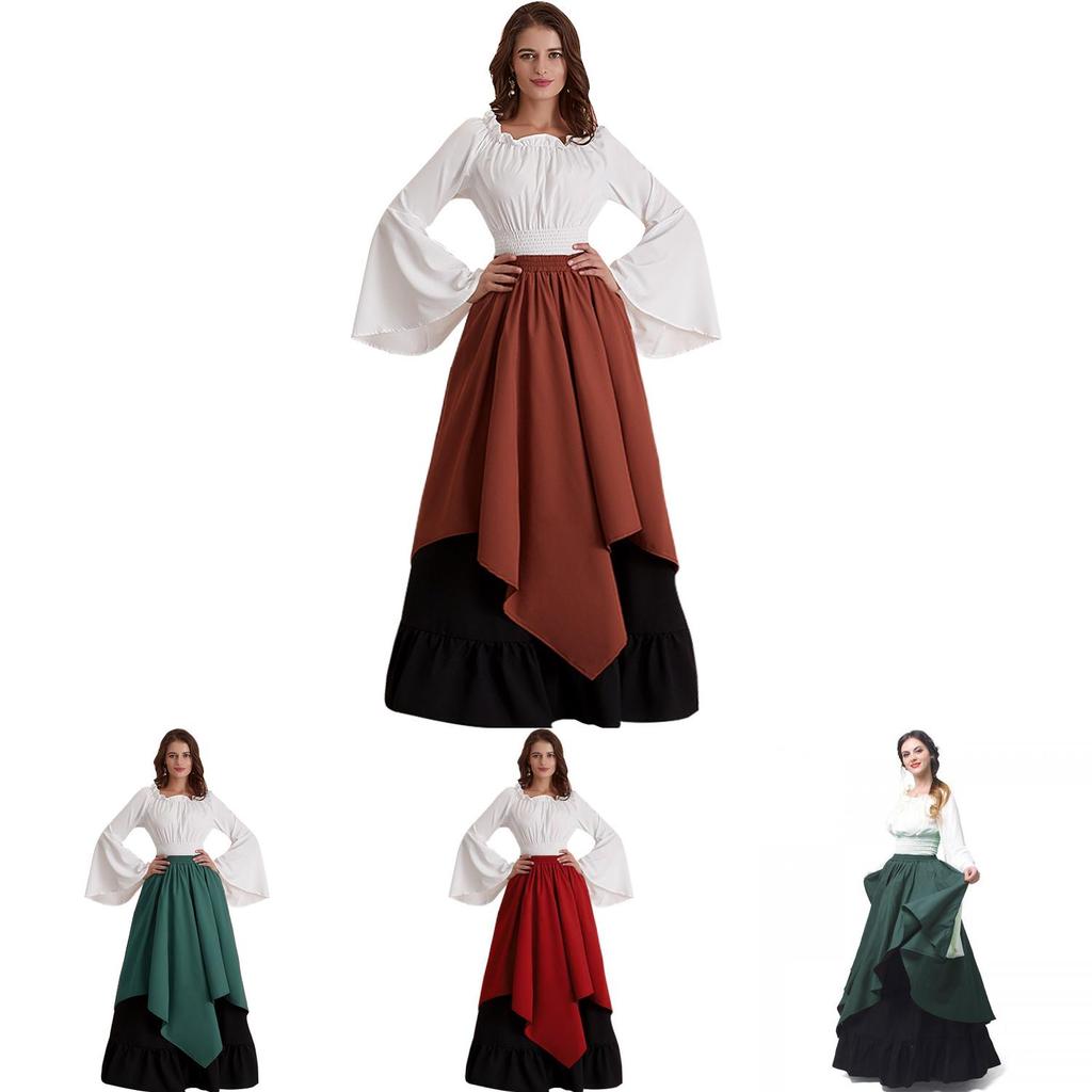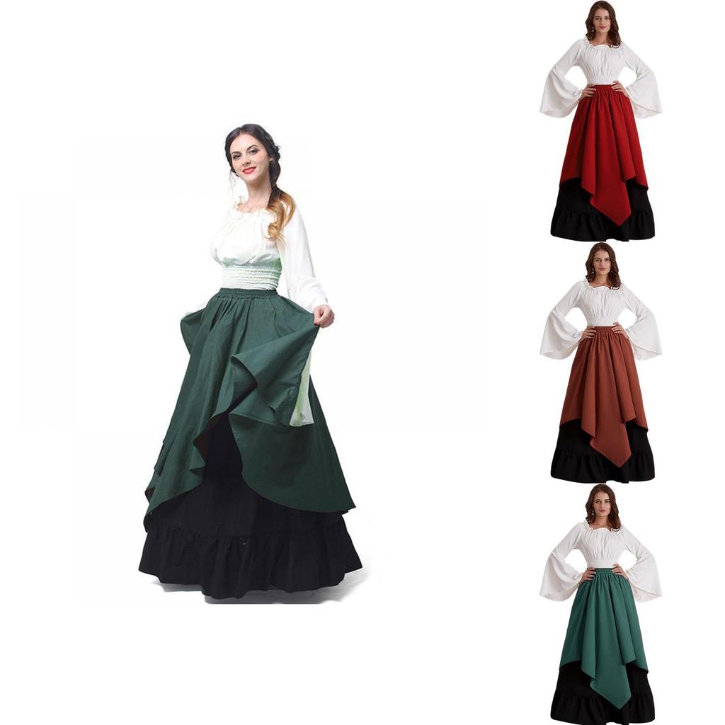 Европейское средневековое женское платье для косплея на Хэллоуин, костюм эпохи Возрождения, комплект из двух частей, синий, красный, зеленый, коричневый