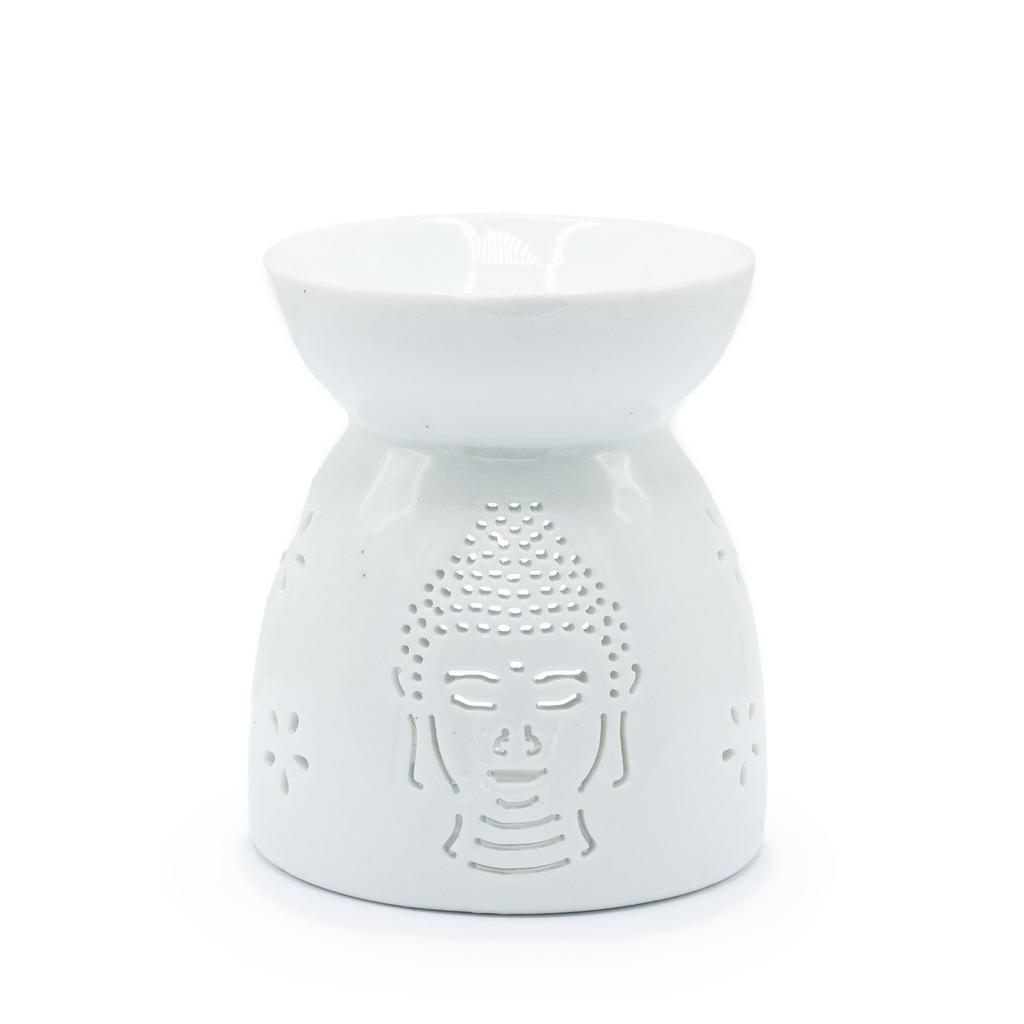 The smooth white finish and rounded lines feel calm under the hand. Openwork cutouts form a stylised Buddha face with small star‑like perforations, letting the candlelight breathe through the base in a soft glow. A gently tapered base supports the integrated bowl for steady warmth and airflow. In many traditions, the Buddha is a respectful symbol of compassion, mindfulness, and inner peace — often kept in quiet corners as a reminder to pause and return to the present. 🧘