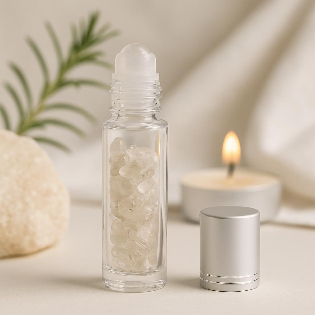 Cool to the touch and clean in line, this roll-on bottle carries your personal scents and oils with quiet elegance. Clear glass reveals a scatter of translucent rock quartz pieces within, topped by a smooth silver-toned cap for a calm, minimalist look. ✨