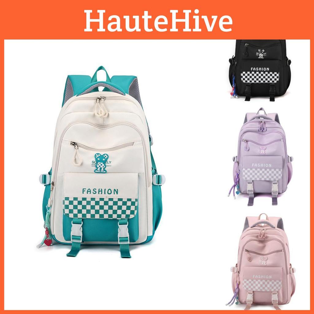 Made with durable nylon fabric, this backpack is designed to withstand daily wear and tear, ensuring long-lasting use for both boys and girls. Available in a variety of colors including pink, black, purple, and blue and white patchwork, with or without adorable hanging pendants to suit your personal style.Say goodbye to back pain and discomfort with the ergonomic design of this backpack, featuring a weight-reducing function that helps distribute the load evenly across your shoulders.