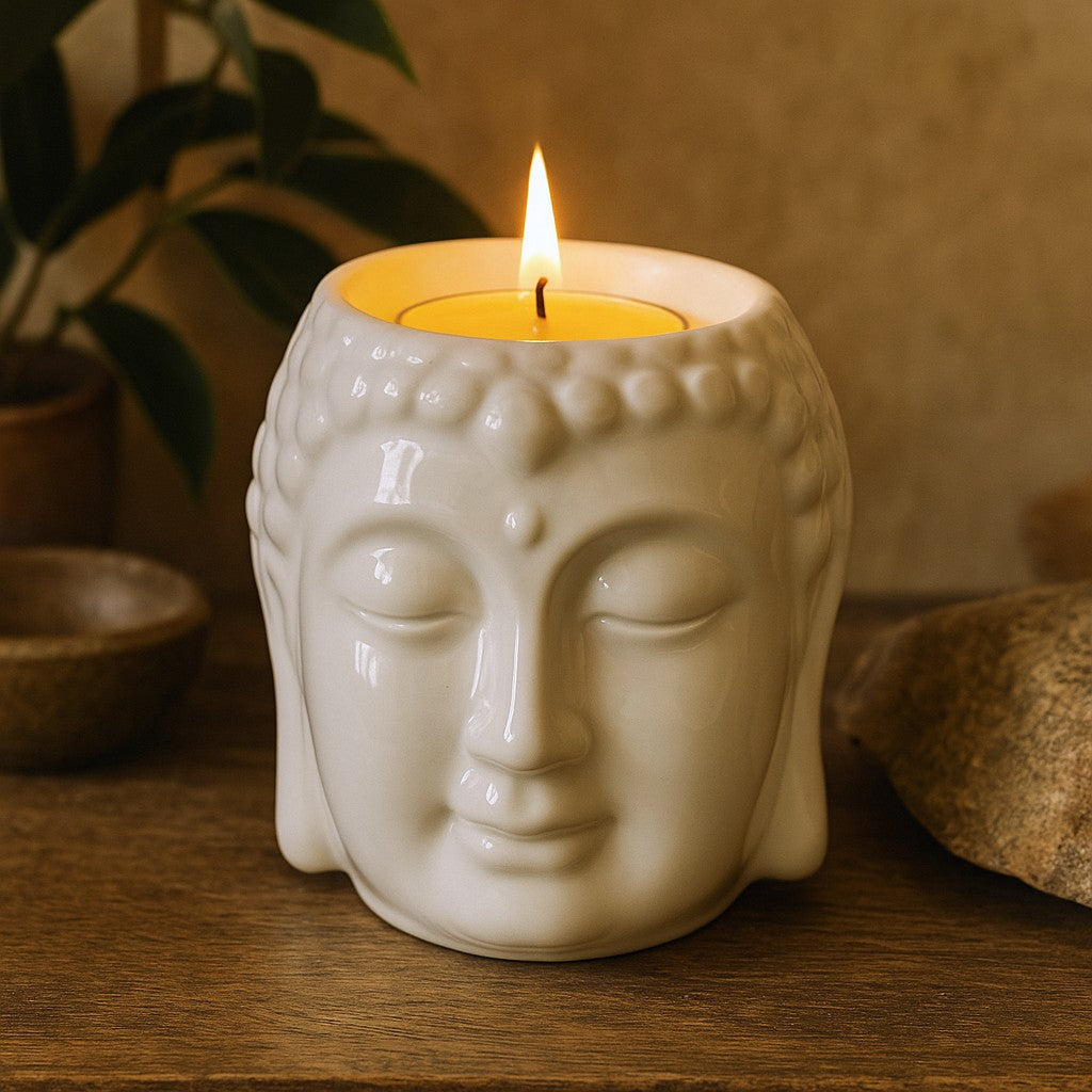 Fill the open bowl at the crown with water and 3–6 drops of essential oil. Place a tealight in the base; the gentle heat will release the aroma gradually. The serene Buddha motif—with closed eyes and softly defined features—carries a widely cherished reminder of mindfulness, compassion, and inner peace, often kept in homes and meditation spaces as a cue to pause and breathe. The high-gloss glaze wipes clean easily; top up water as it evaporates, and use on a heat-safe surface. ✨