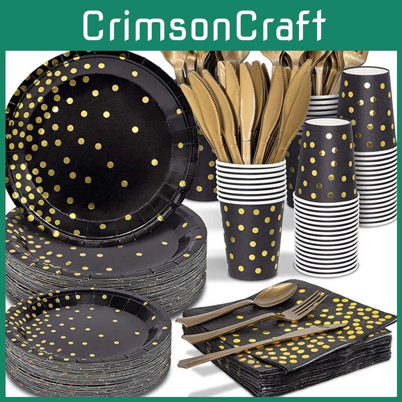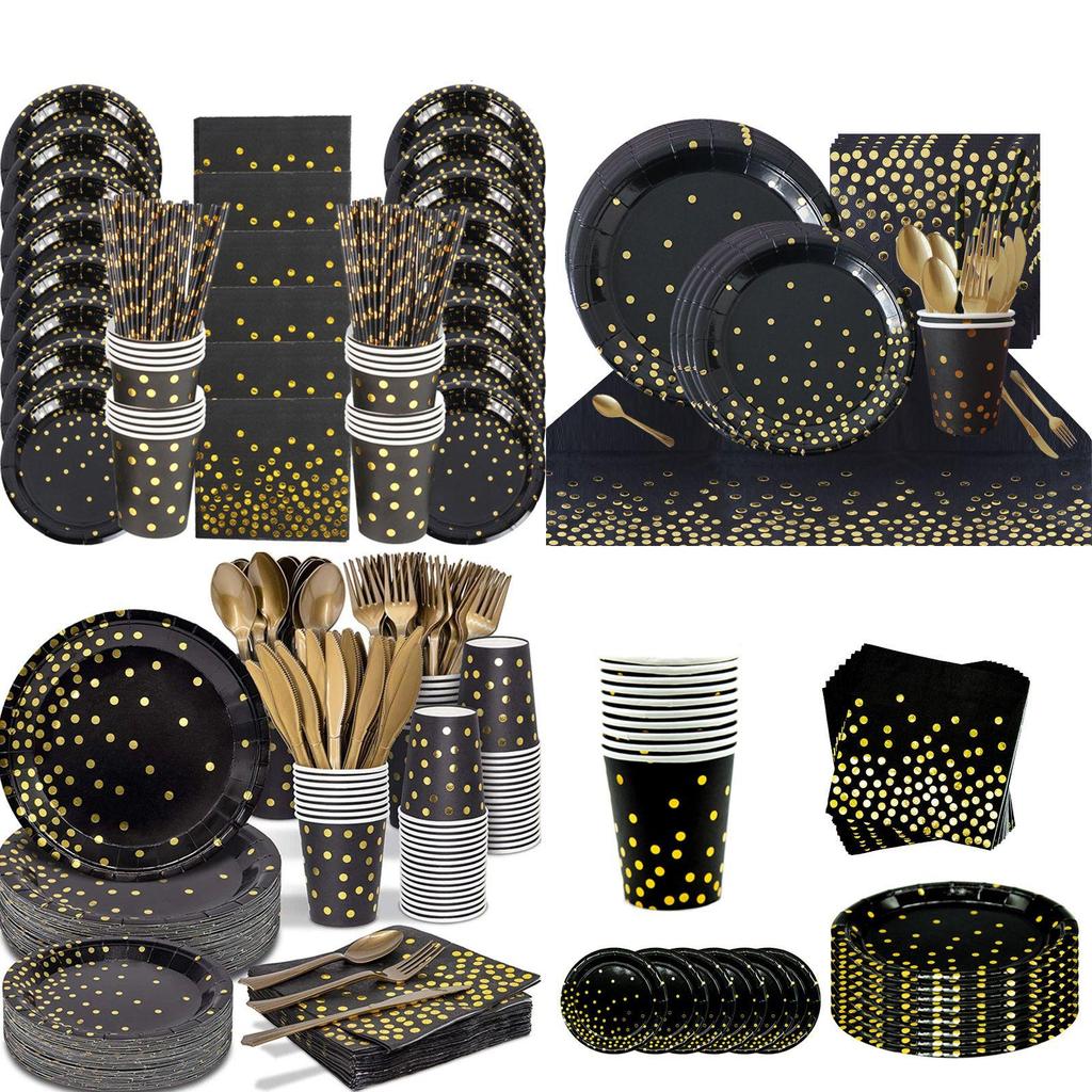 Стильная одноразовая посуда с тиснением черным золотом, создающая праздничную атмосферу для вечеринок