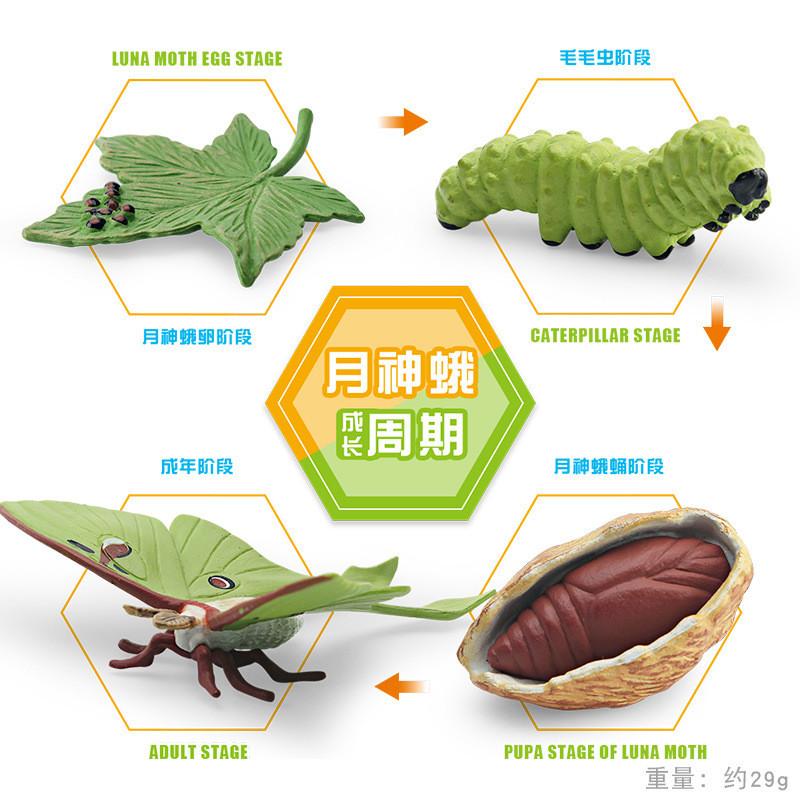 Реалистичный дизайн: Каждая фигурка в наборе модели цикла роста Лунного мотылька тщательно изготовлена из ПВХ премиум-класса, что обеспечивает реалистичный внешний вид, передающий сложные детали стадий жизни Лунного мотылька.