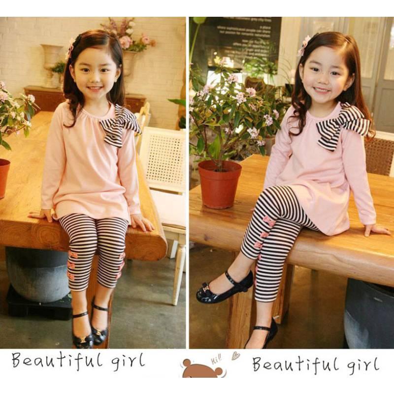 Очаровательные 2 предмета для малышей, детей, девочек, наряды с топом с бантом и полосатыми леггинсами