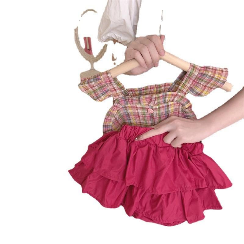 Очаровательный хлопковый комплект-двойка для девочек в корейском стиле на лето со сладким клетчатым дизайном
