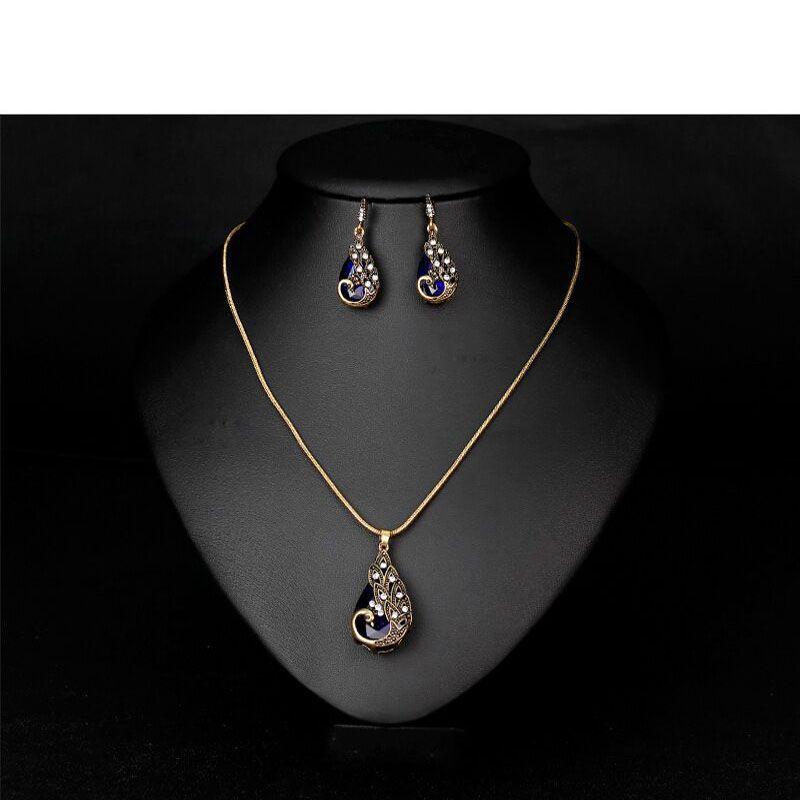 Elegant Christmas Waterdrop Blue Zircon Peacock Pendant Necklace And Earring Combination Gift Set