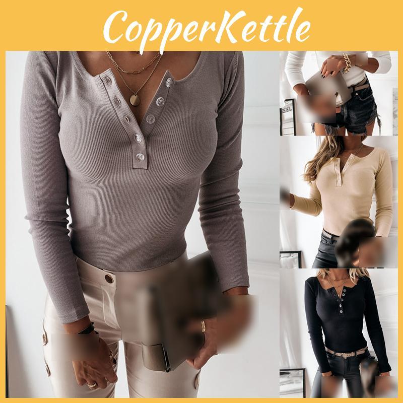 Модная женская футболка с длинным рукавом, V-образным вырезом и пуговицами, однотонная, для повседневных нарядов