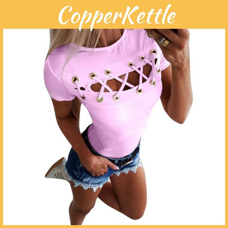 Elegant Sexy Ladies Women's Short Sleeve Cross Lace Up Bodycon Blouse Tops Slim T-shirt