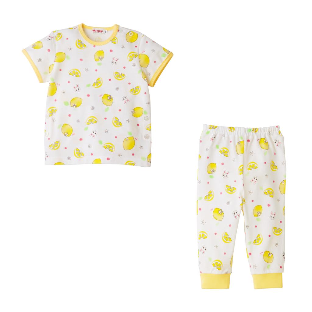 These short-sleeved pajamas from Mikihouse feature a bunny and a refreshing lemon print. They have a smooth, textured surface and a refreshing tucked jersey print. These popular kids' pajamas are pull-over style and can be worn without buttons, making them easy for children to put on and take off by themselves.