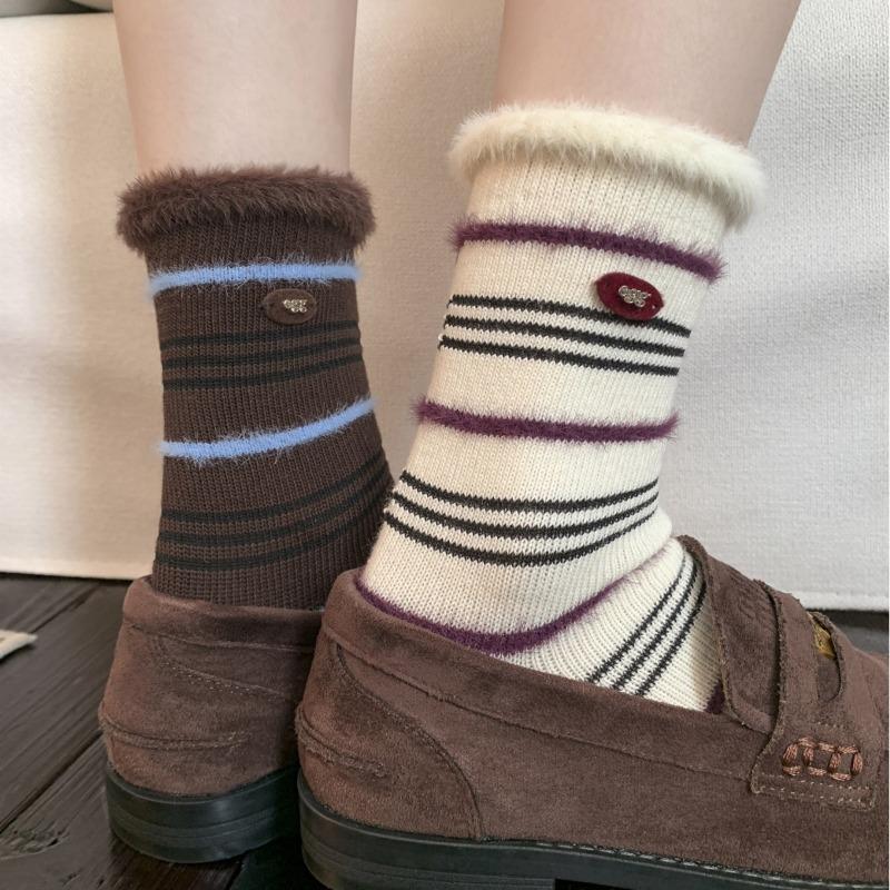 Полосатые носки из меха норки для женщин на осень и зиму, хлопковые носки до середины икры с пуговицами, ретро носки с флокированным ворсом для тепла