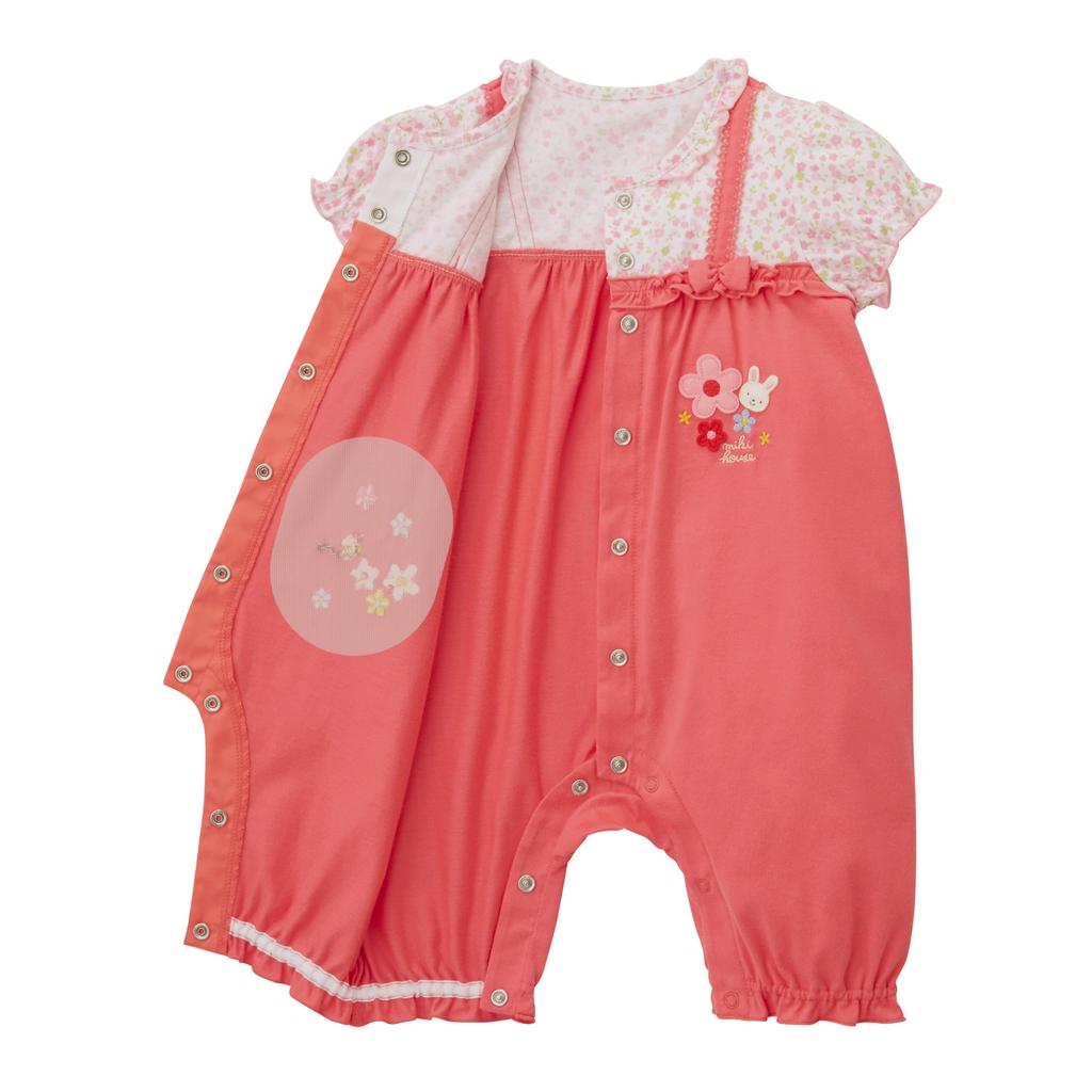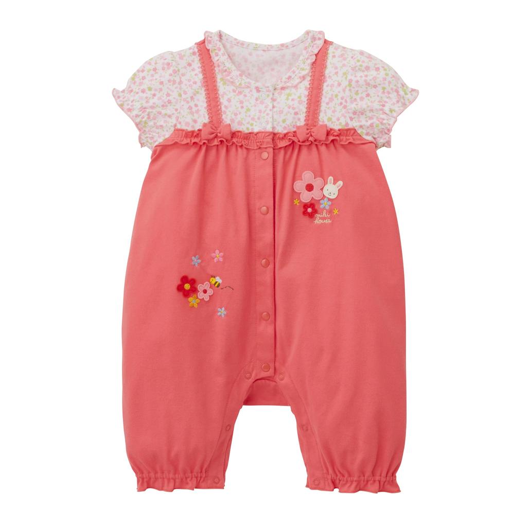 ☆ These are Miki House shortalls and short-sleeved rompers with an overalls-like feel. The separate design, which resembles a camiole worn over a short-sleeved T-shirt with a small floral print, makes them a great baby shower or gift. The cute embroidery of rabbits and flowers is the highlight, and the three-quarter length inseam makes them ideal for crawling babies. The front hooks open all the way down to the crotch, making them convenient for changing clothes and diapers. With a gusset at the bottom, these Miki House coveralls and rompers are perfect for active children.