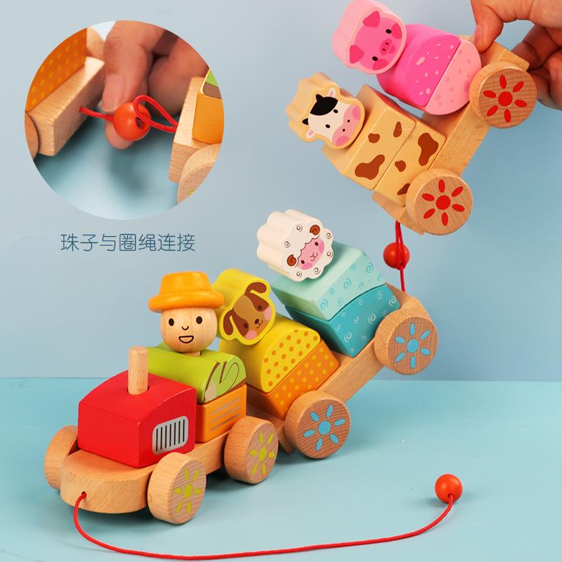 Cross-border children's wooden three-section tractor train, animal pairing assembly color cognition early childhood education building block toy