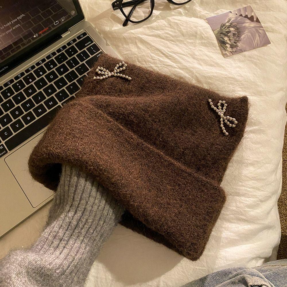 Bow Knitted Pullover Hat Fluffy Winter Wool Hat Windproof Cat Ears Beanie Hat Outdoor